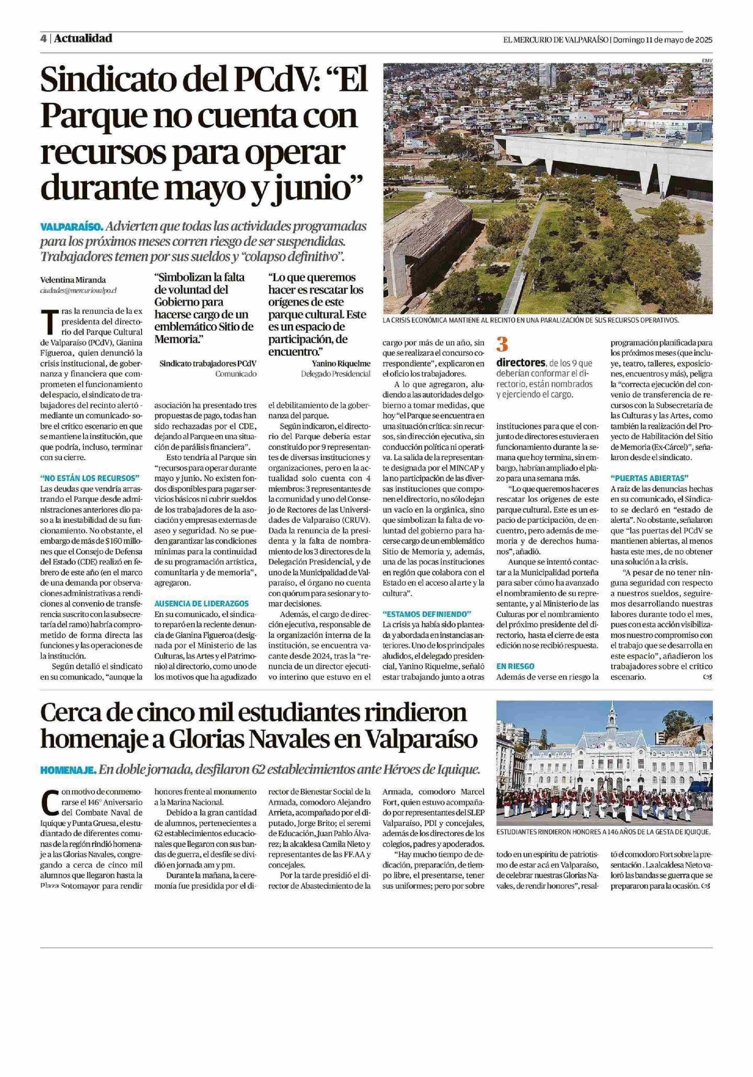 Sindicato del PCdV: “El Parque no cuenta con recursos para operar durante mavo y junio” 11-05-2025 El Mercurio de Valparaíso |