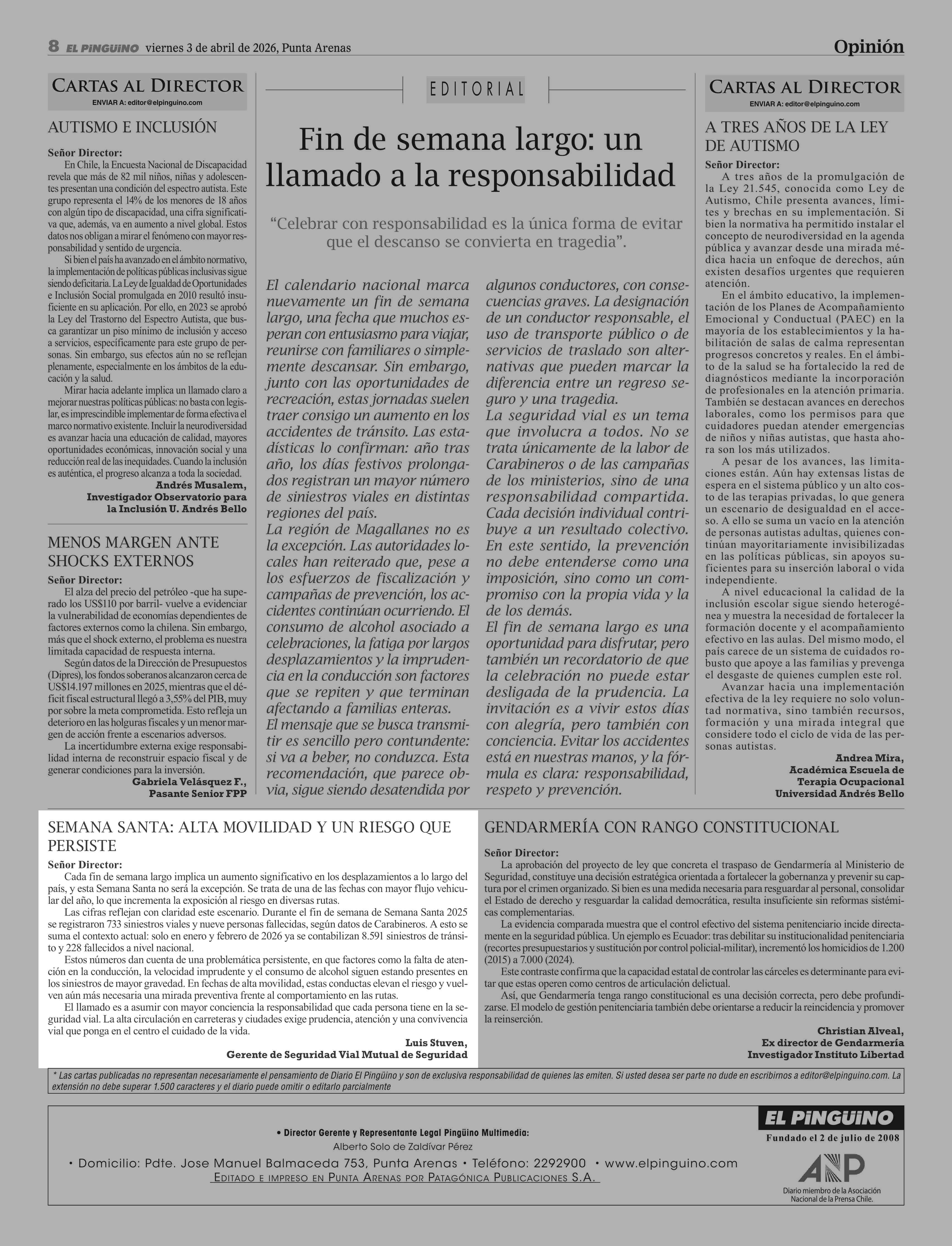 Cartas: SemAnA sAntA: AltA movilidAd y un riesgo que persiste 03-04-2026 El Pingüino |