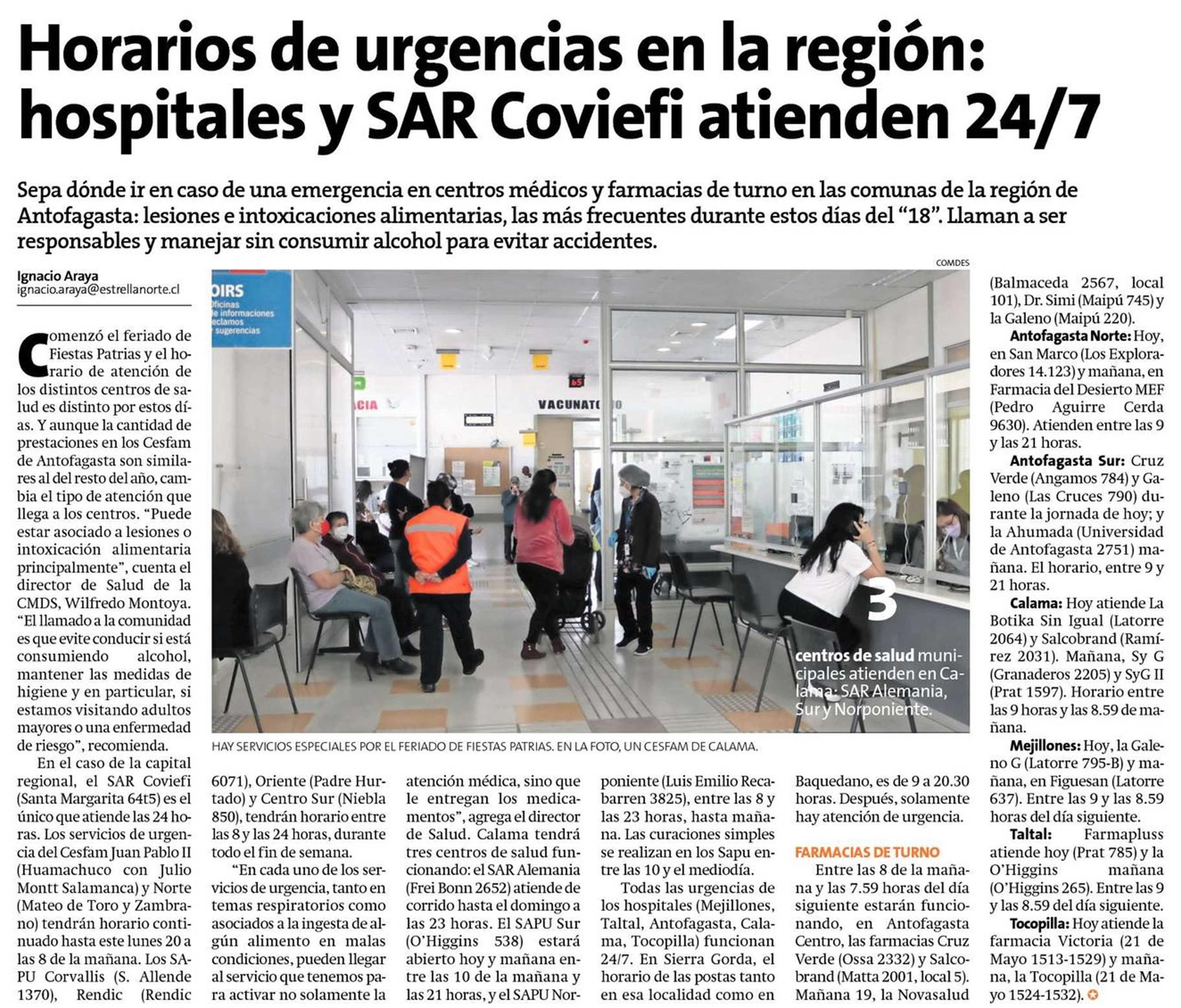Horarios de urgencias en la región: hospitales y SAR Coviefi atienden 24/7 18-09-2021 La Estrella Del Loa |