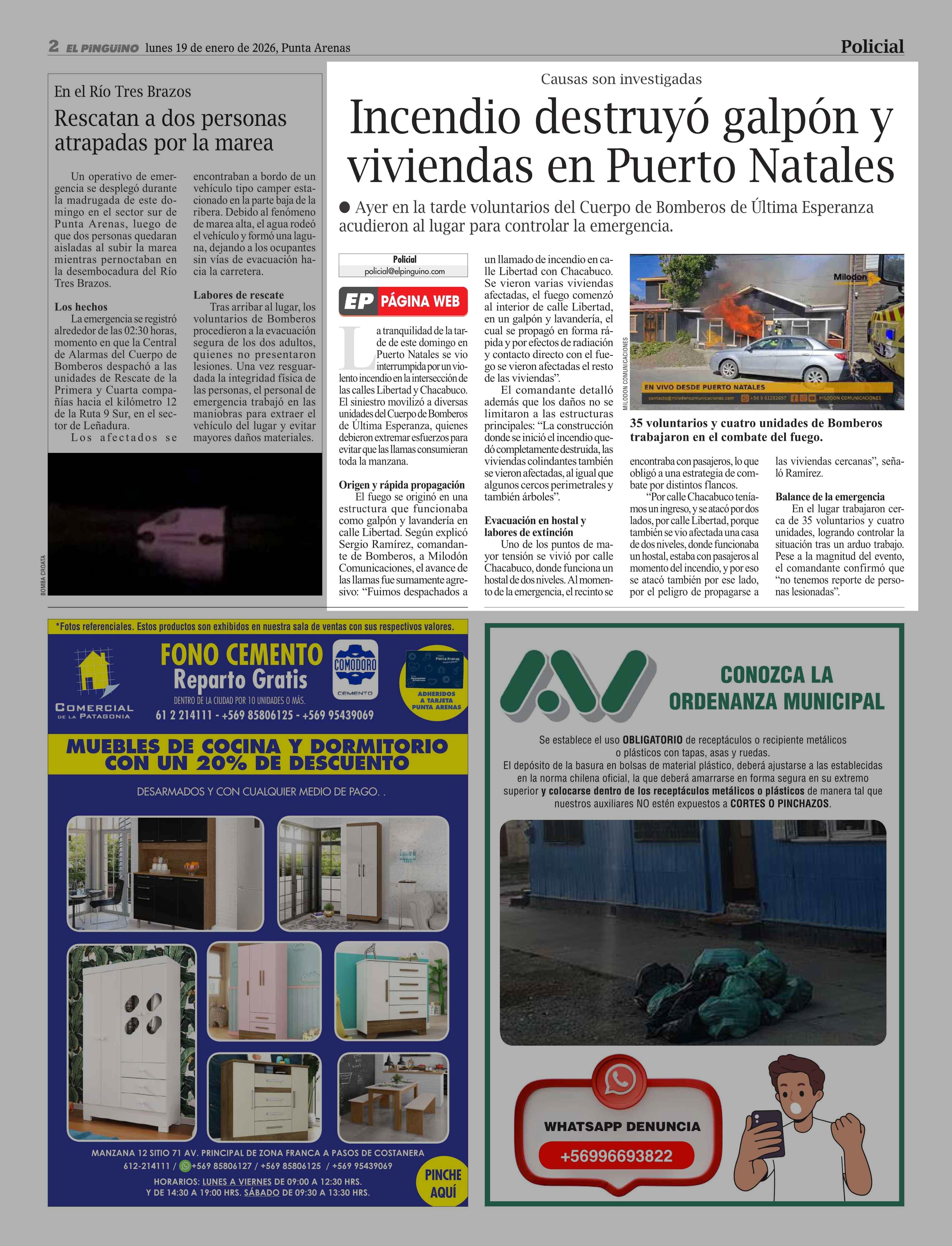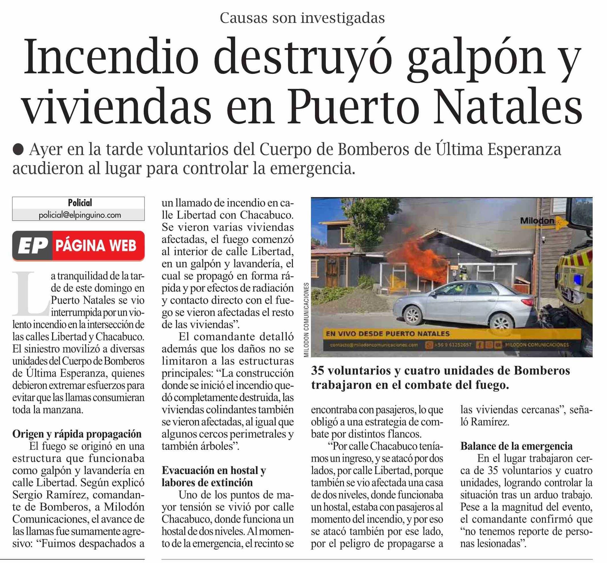 Incendio destruyó galpón y viviendas en Puerto Natales 19-01-2026 El Pingüino |