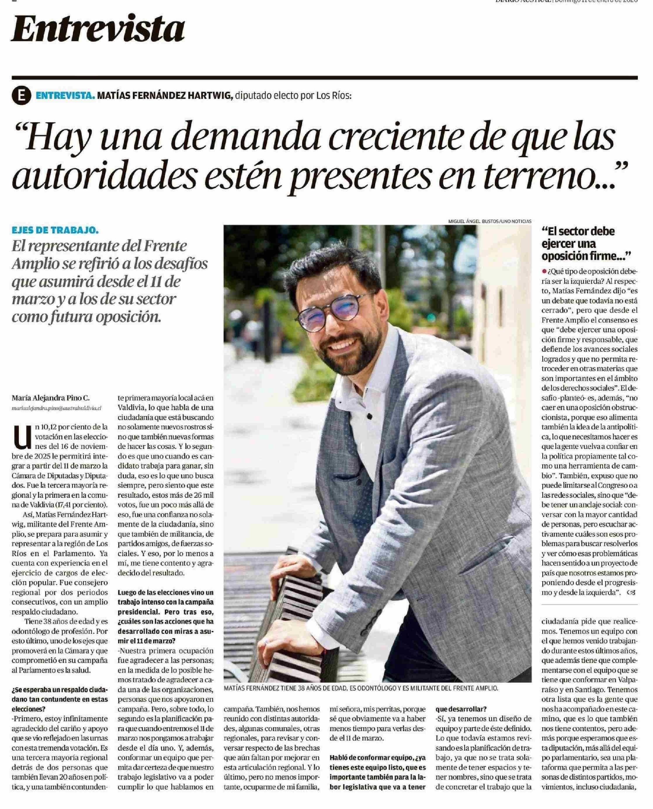 "Hay una demanda creciente de que las autoridades estén presentes en terreno ... " 11-01-2026 Diario Austral Región de Los Ríos |