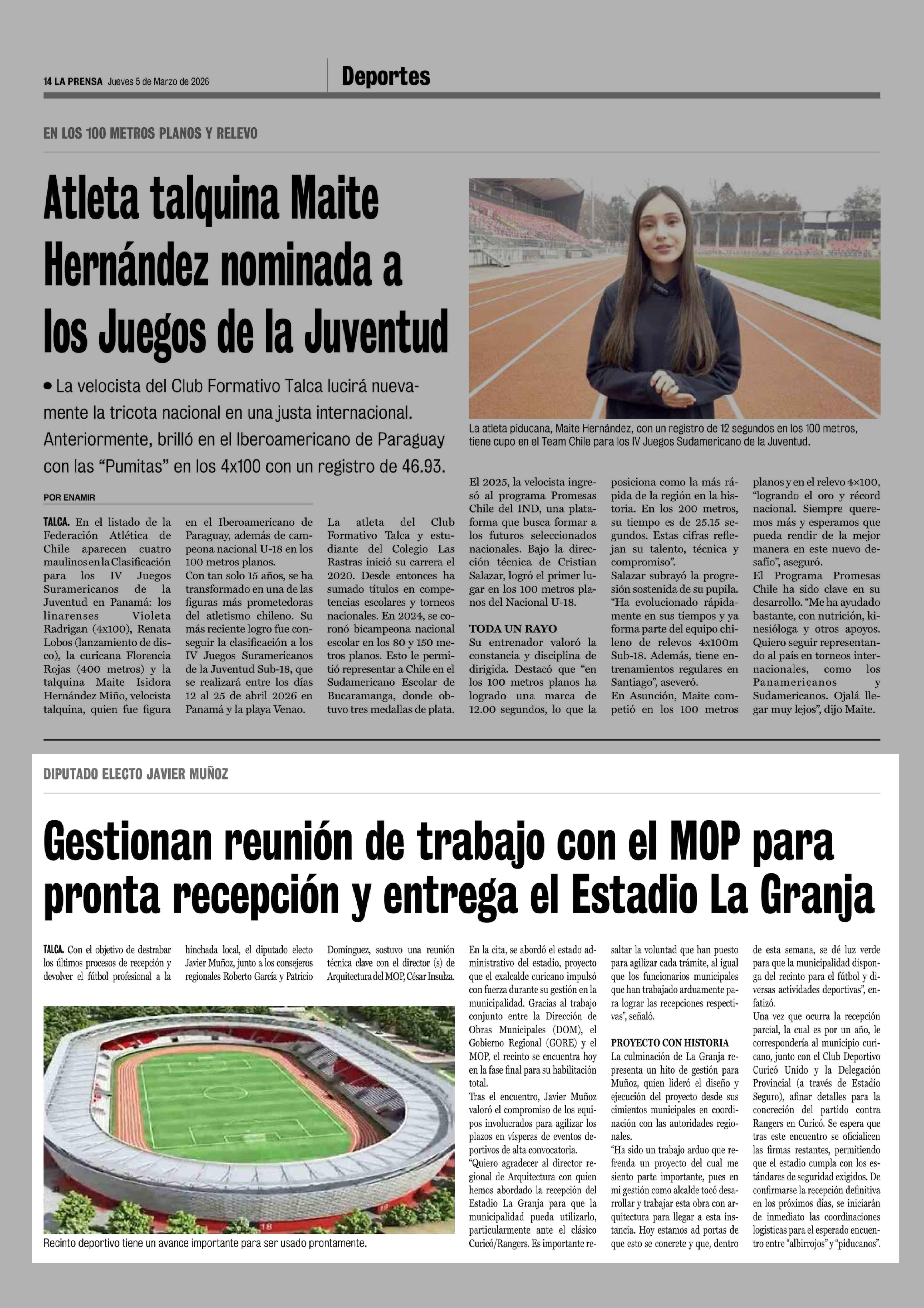 Gestionan reunión de trabajo con el MOP para pronta recepción y entrega el Estadio La Granja 05-03-2026 La Prensa de Curicó |