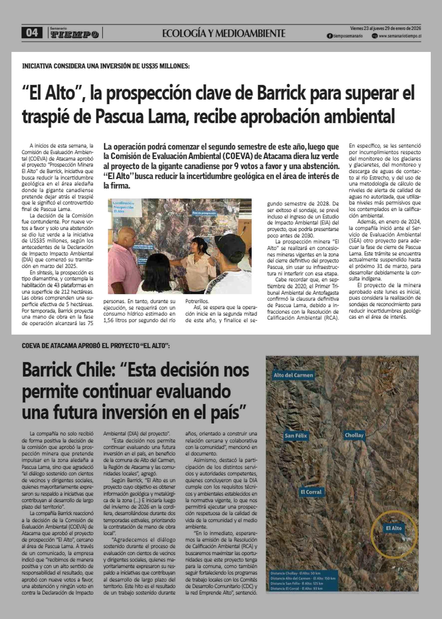 "El Alto", la prospección clave de Barrick para superar el traspié de Pascua Lama, recibe aprobación ambiental 23-01-2026 Semanario Tiempo |