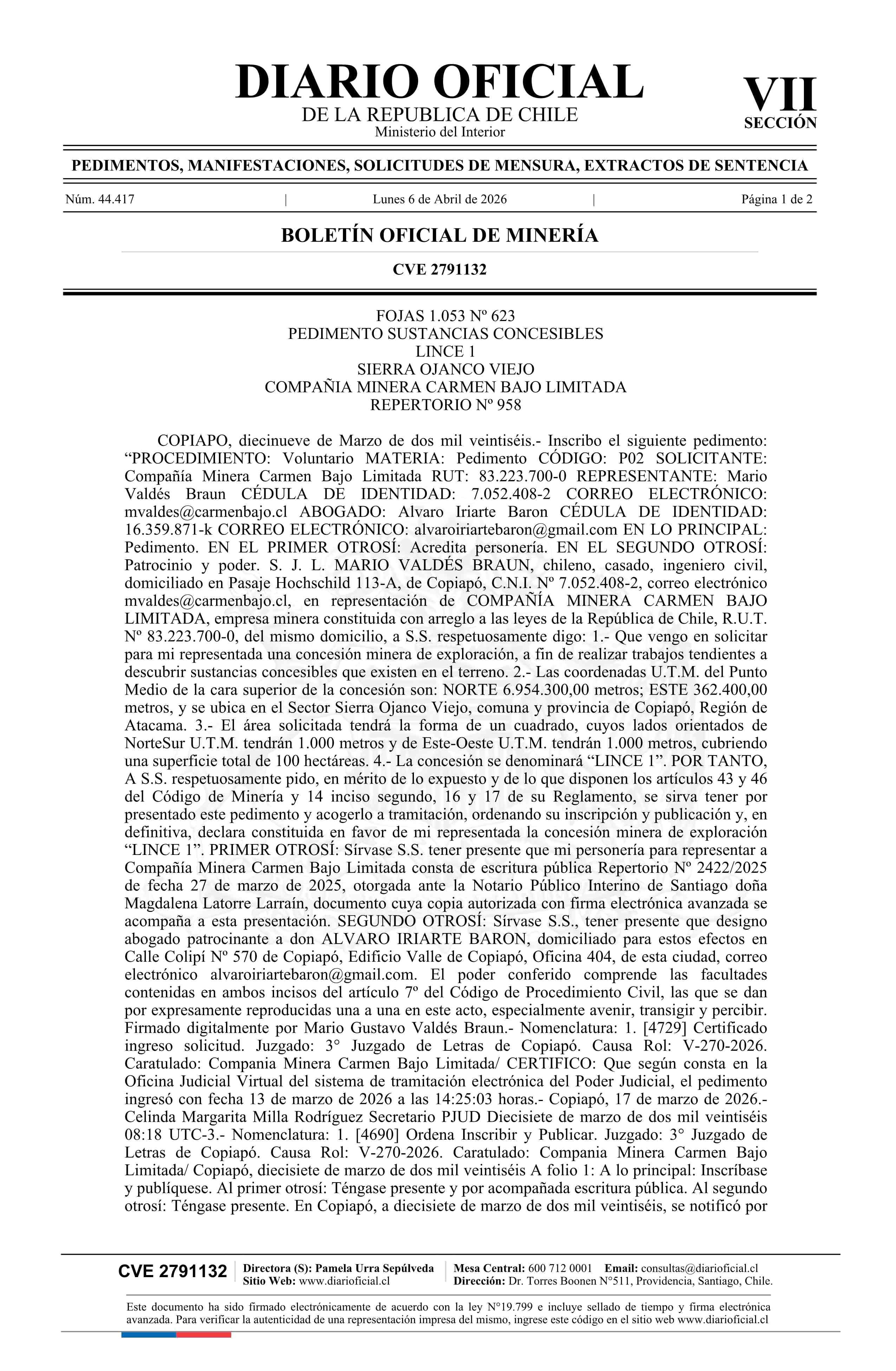 LINCE 1 / Compañía Minera Carmen Bajo Limitada 06-04-2026 DIARIO OFICIAL CHILE - BOLETÍN OFICIAL DE MINERÍA |