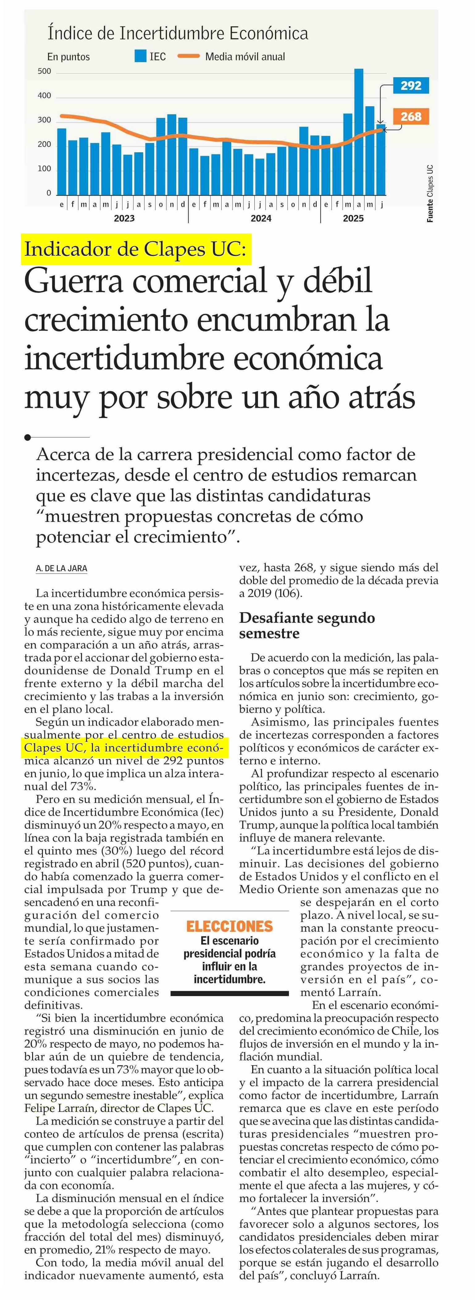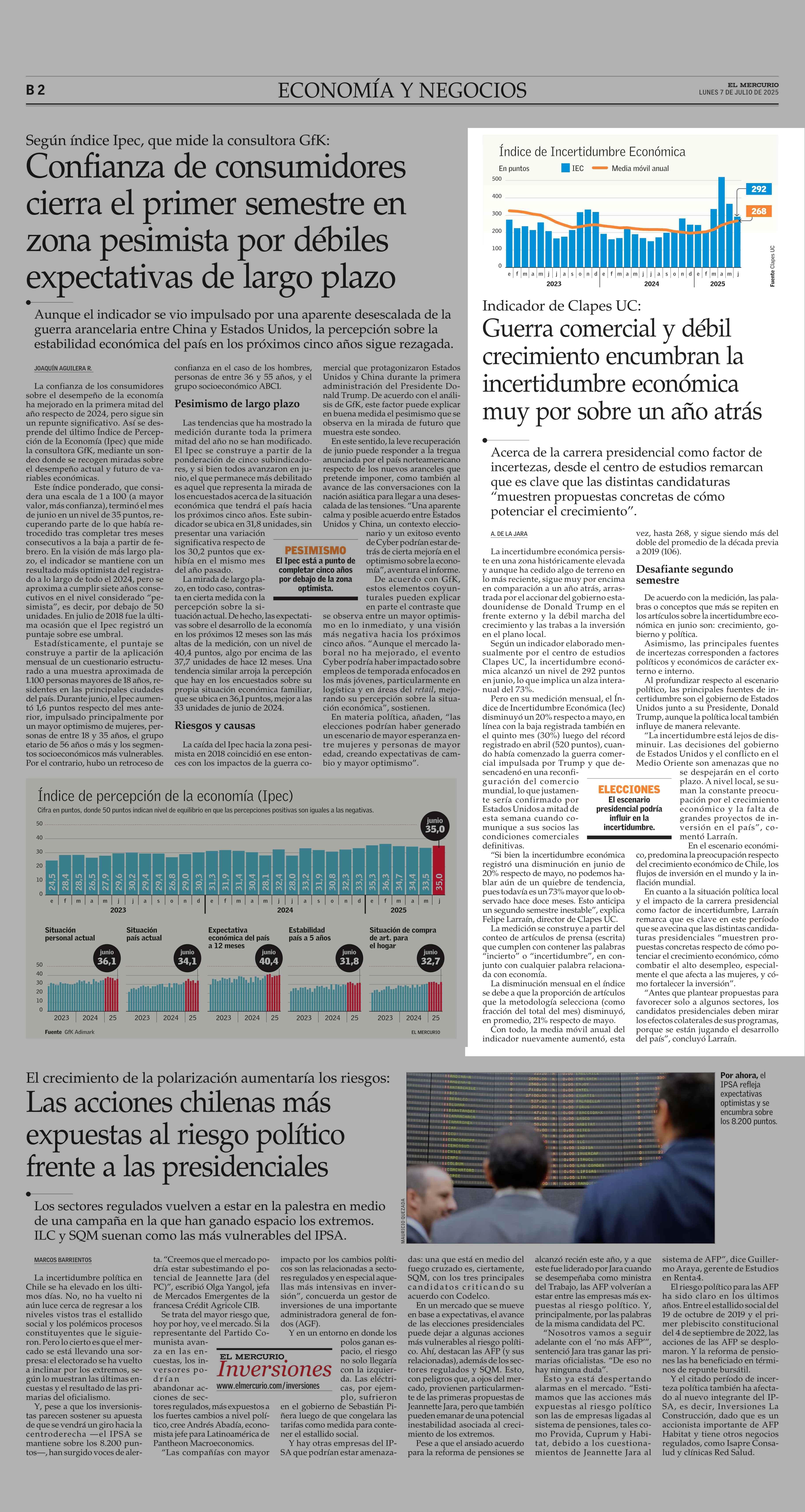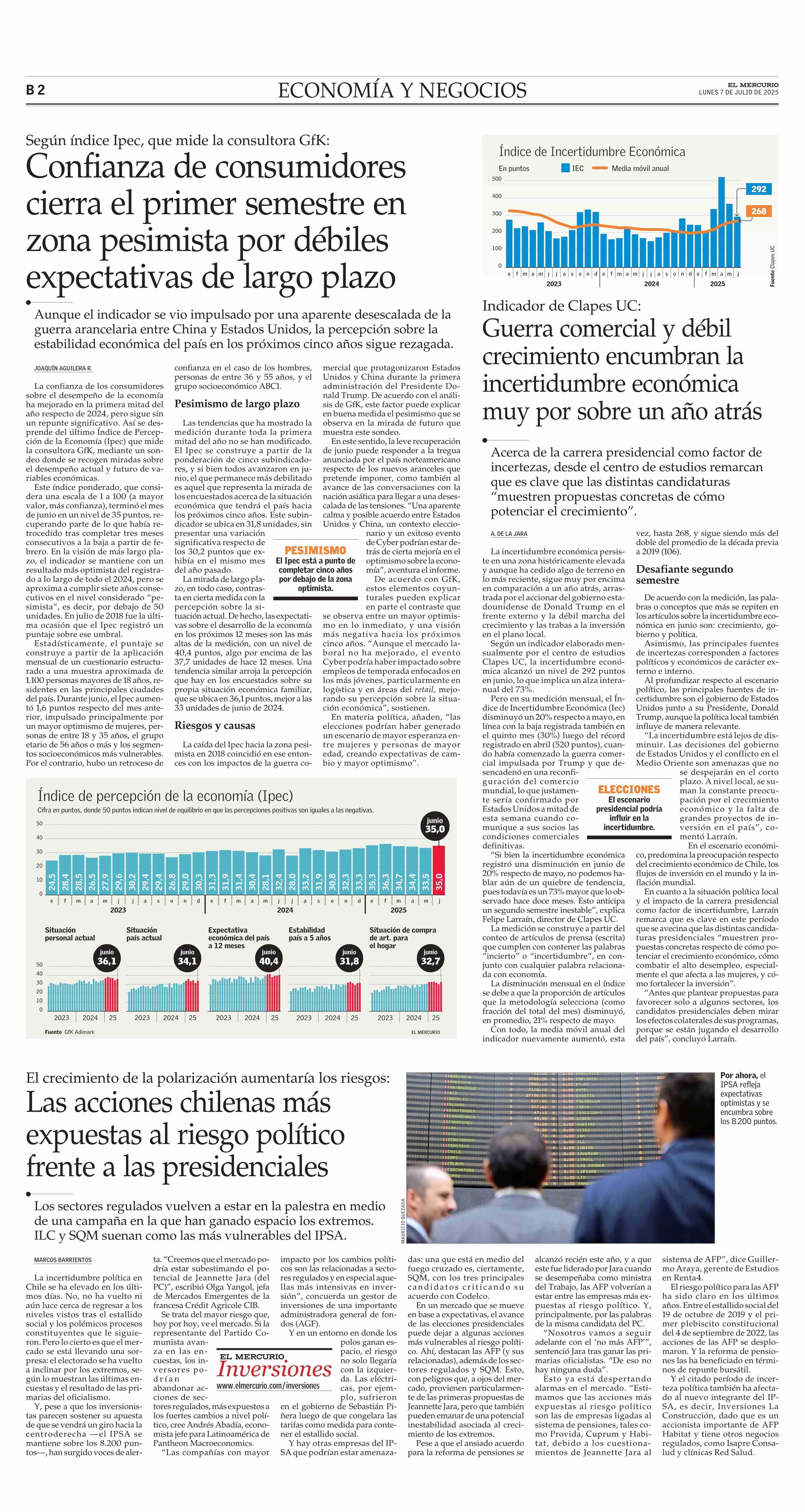 Guerra comercial y débil crecimiento encumbran la incertidumbre económica muy por sobre un año atrás 07-07-2025 El Mercurio |