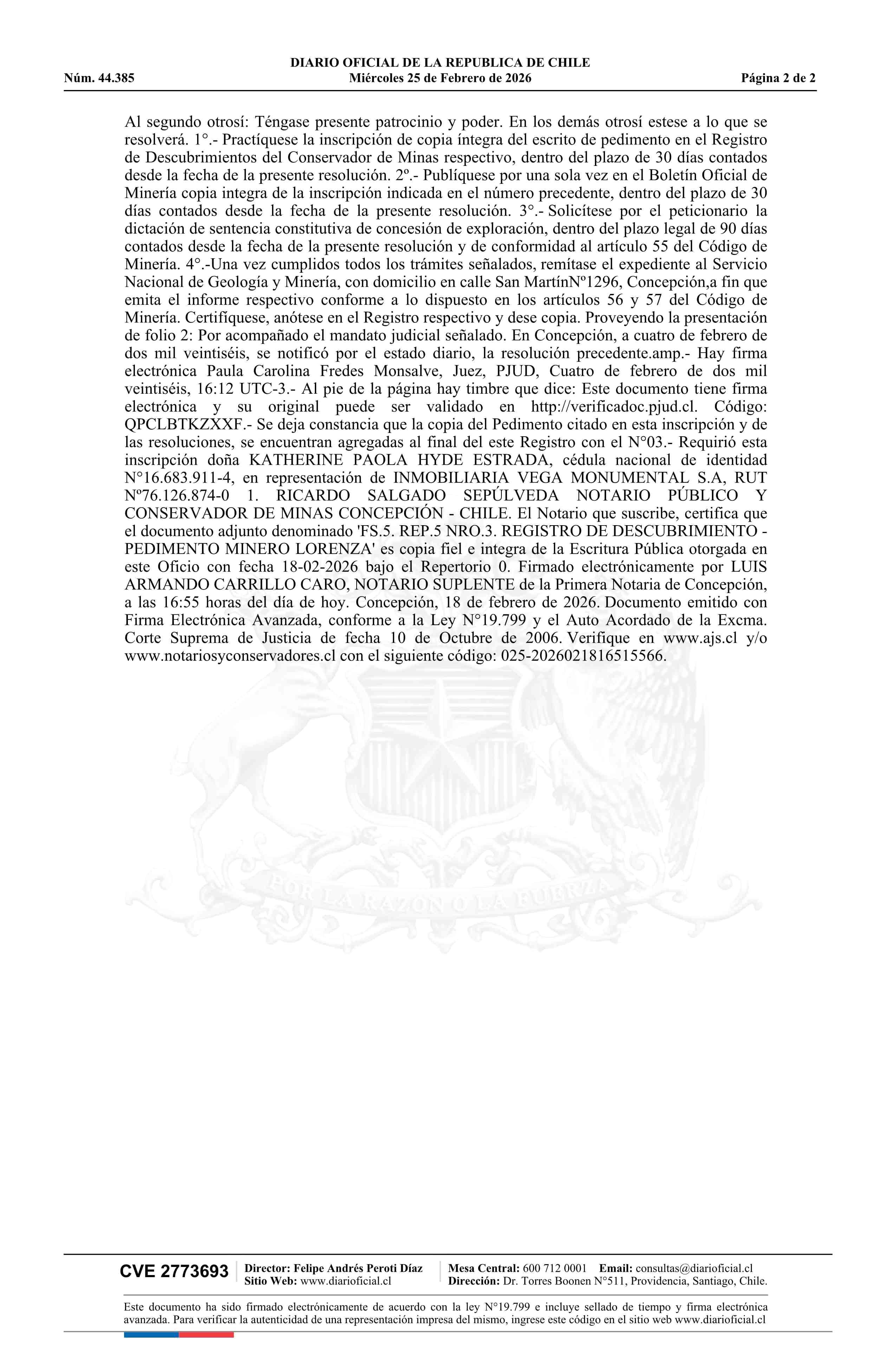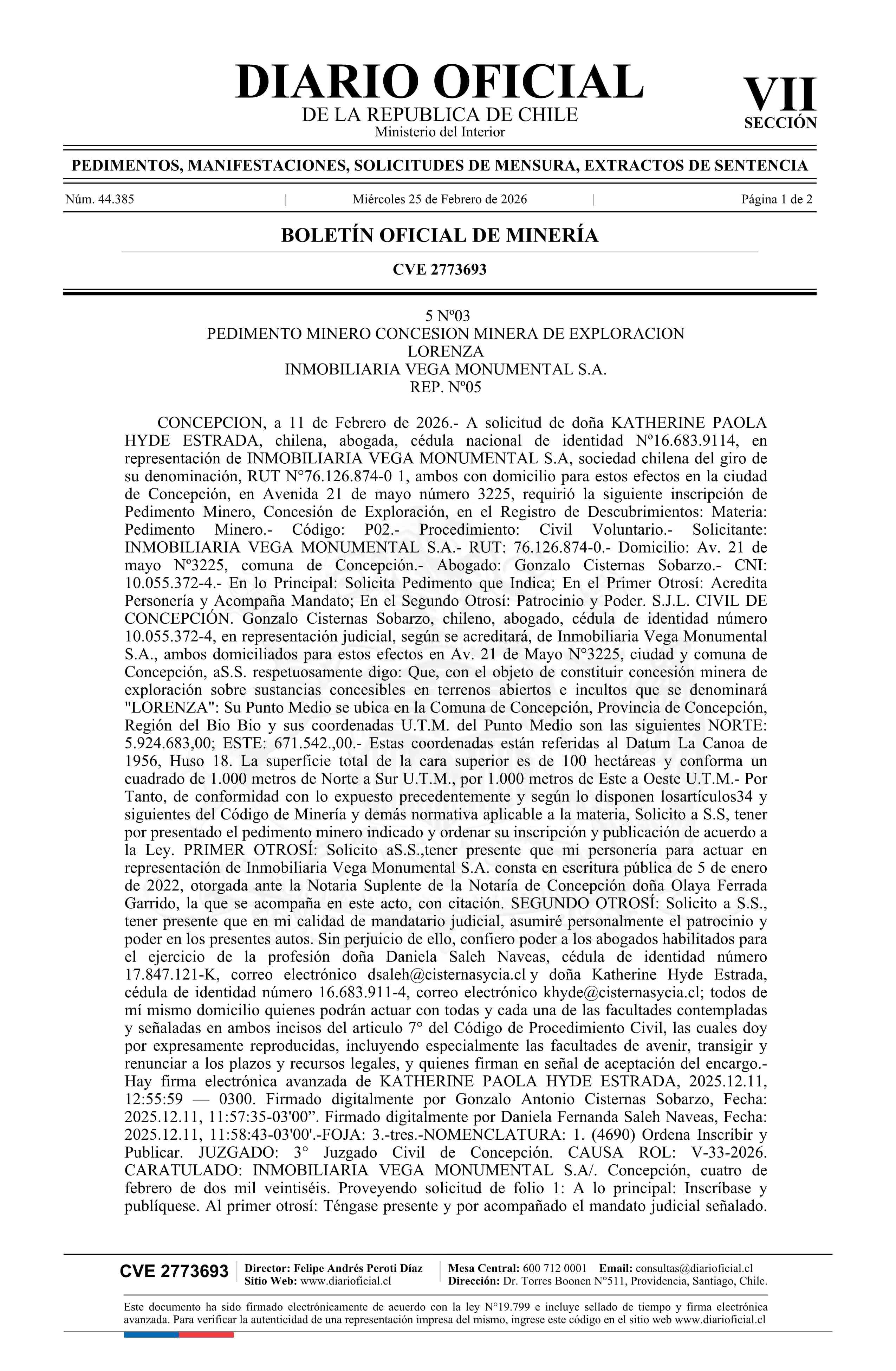 LORENZA / Inmobiliaria Vega Monumental S.A. 25-02-2026 DIARIO OFICIAL CHILE - BOLETÍN OFICIAL DE MINERÍA |