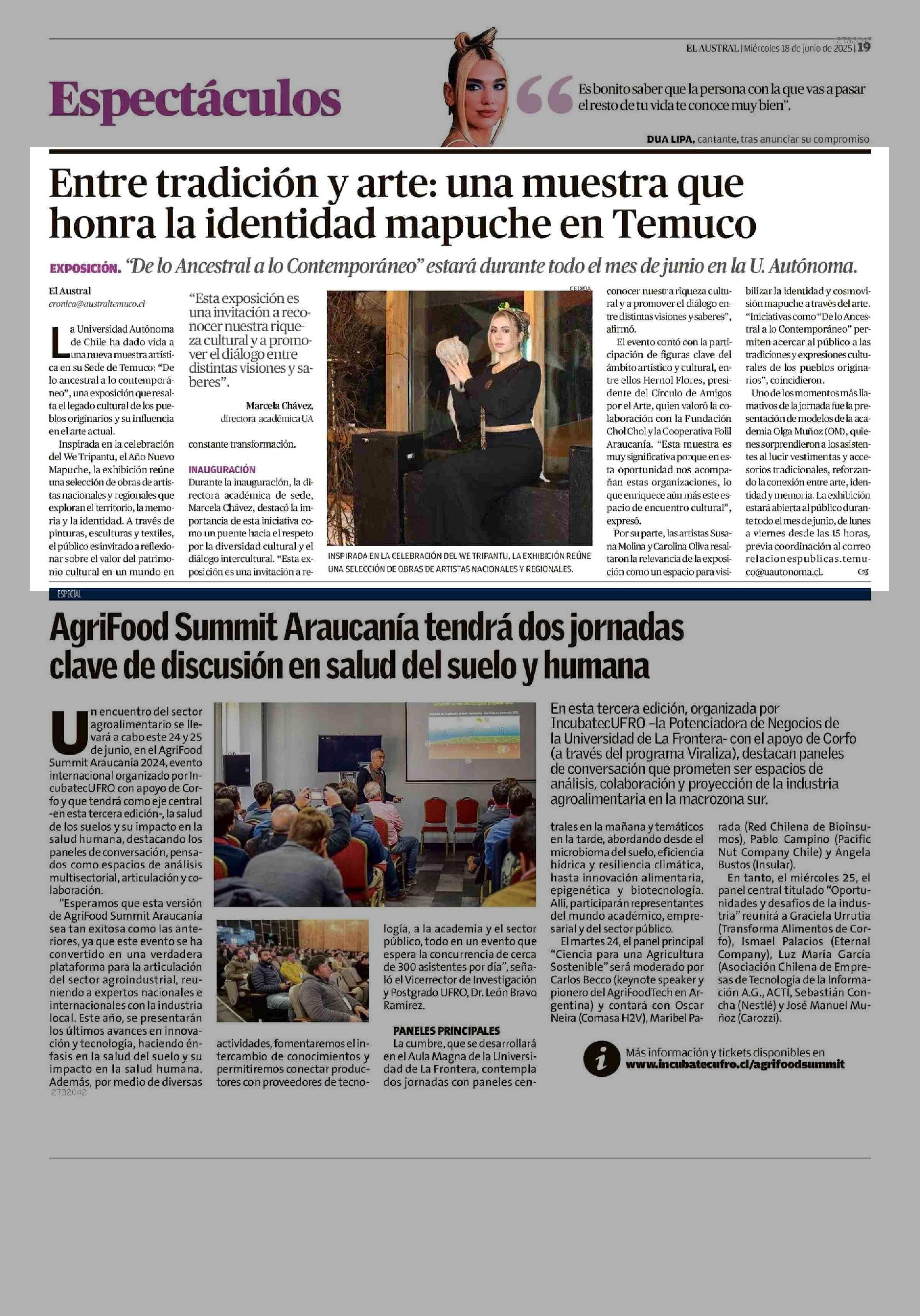 Entre tradición y arte: una muestra que honra la identidad mapuche en Temuco 18-06-2025 El Austral de la Araucanía |