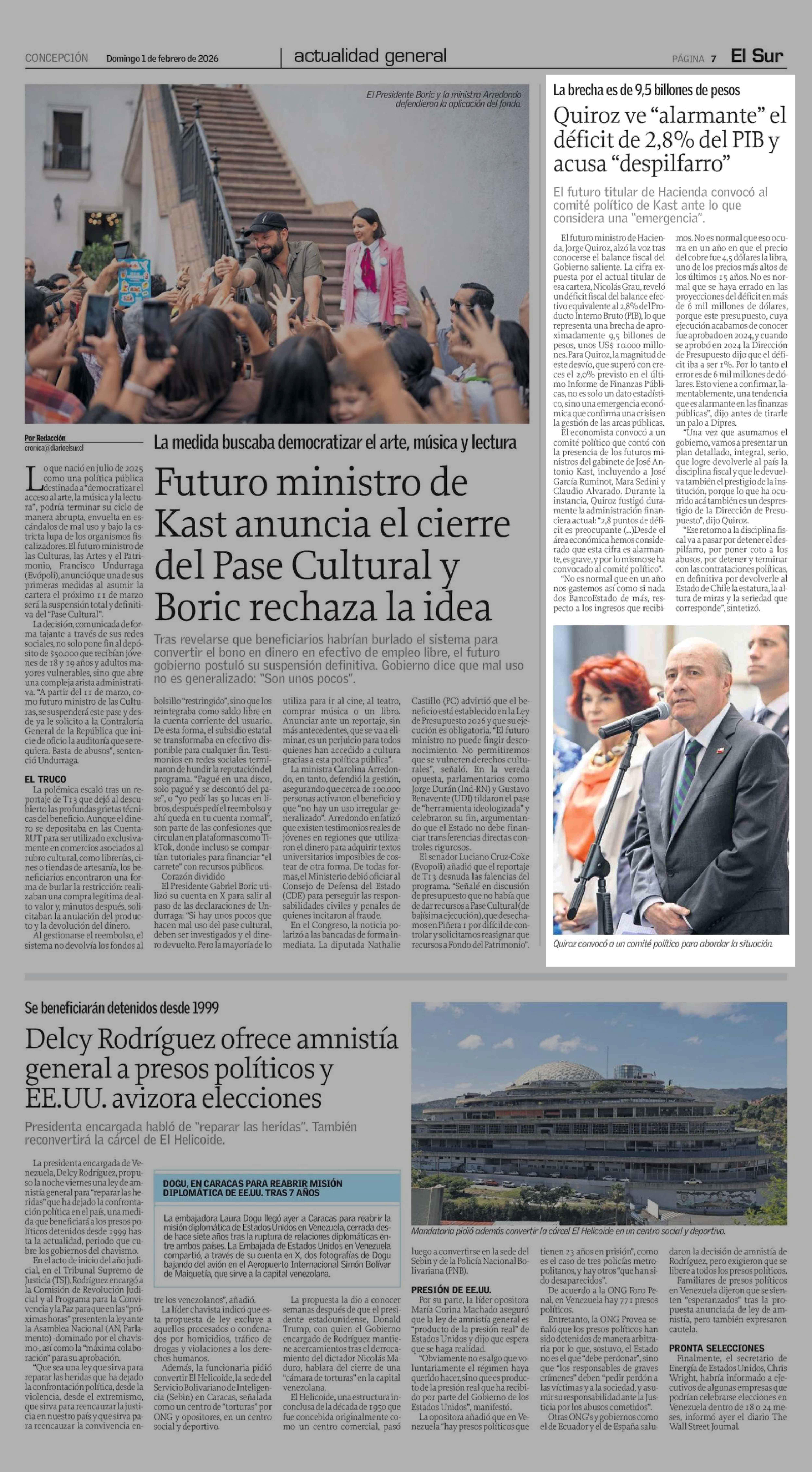 Quiroz ve "alarmante" el déficit de 2,8% del PIB y acusa "despilfarro" 01-02-2026 El Sur |