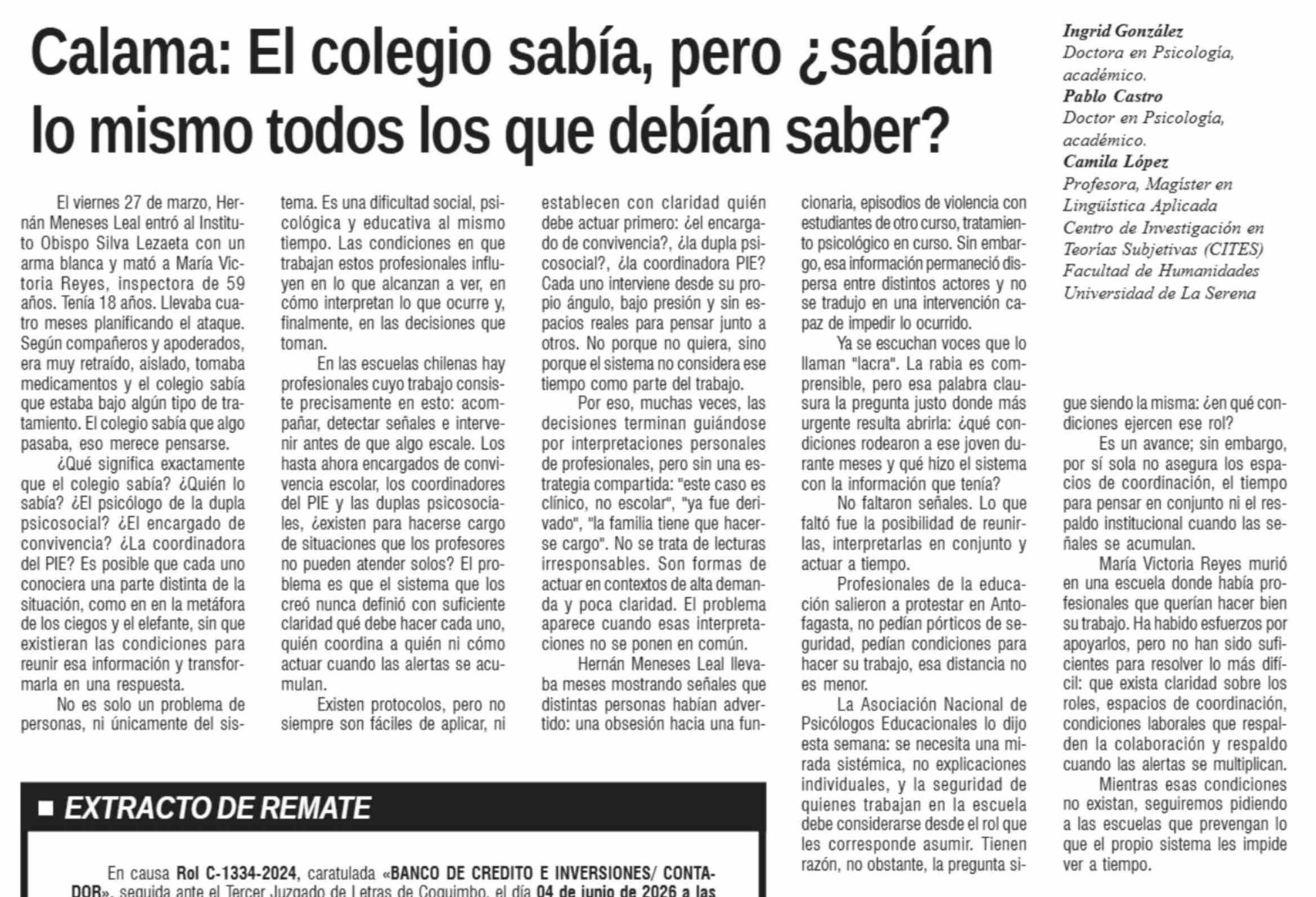 Calama: El colegio sabía, pero ¿sabían lo mismo todos los que debían saber? 09-04-2026 Diario la Región |