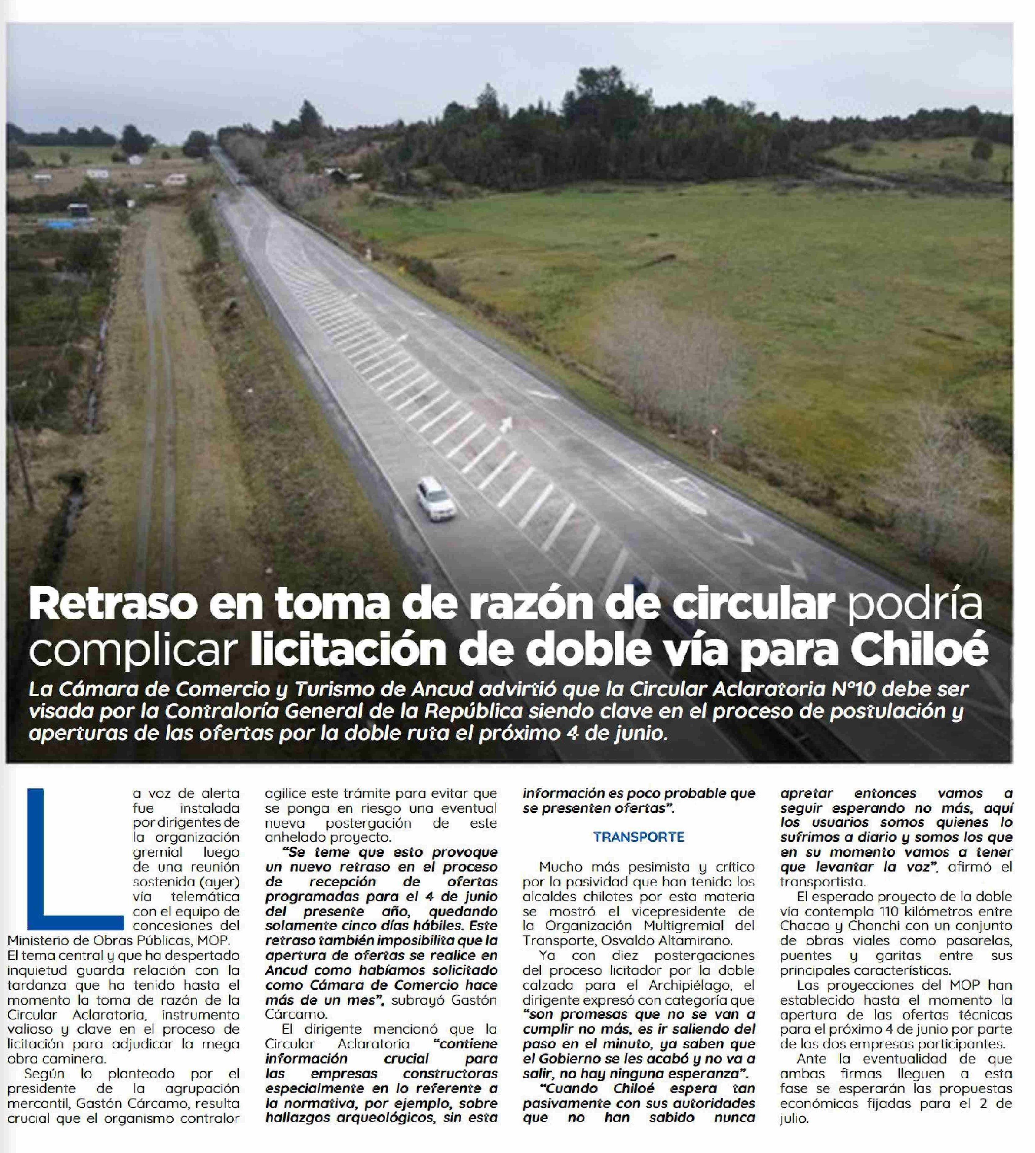 Retraso en toma de razón dé circular podría comphcar licitación de doble vía para Chiloé 28-05-2025 El Insular |