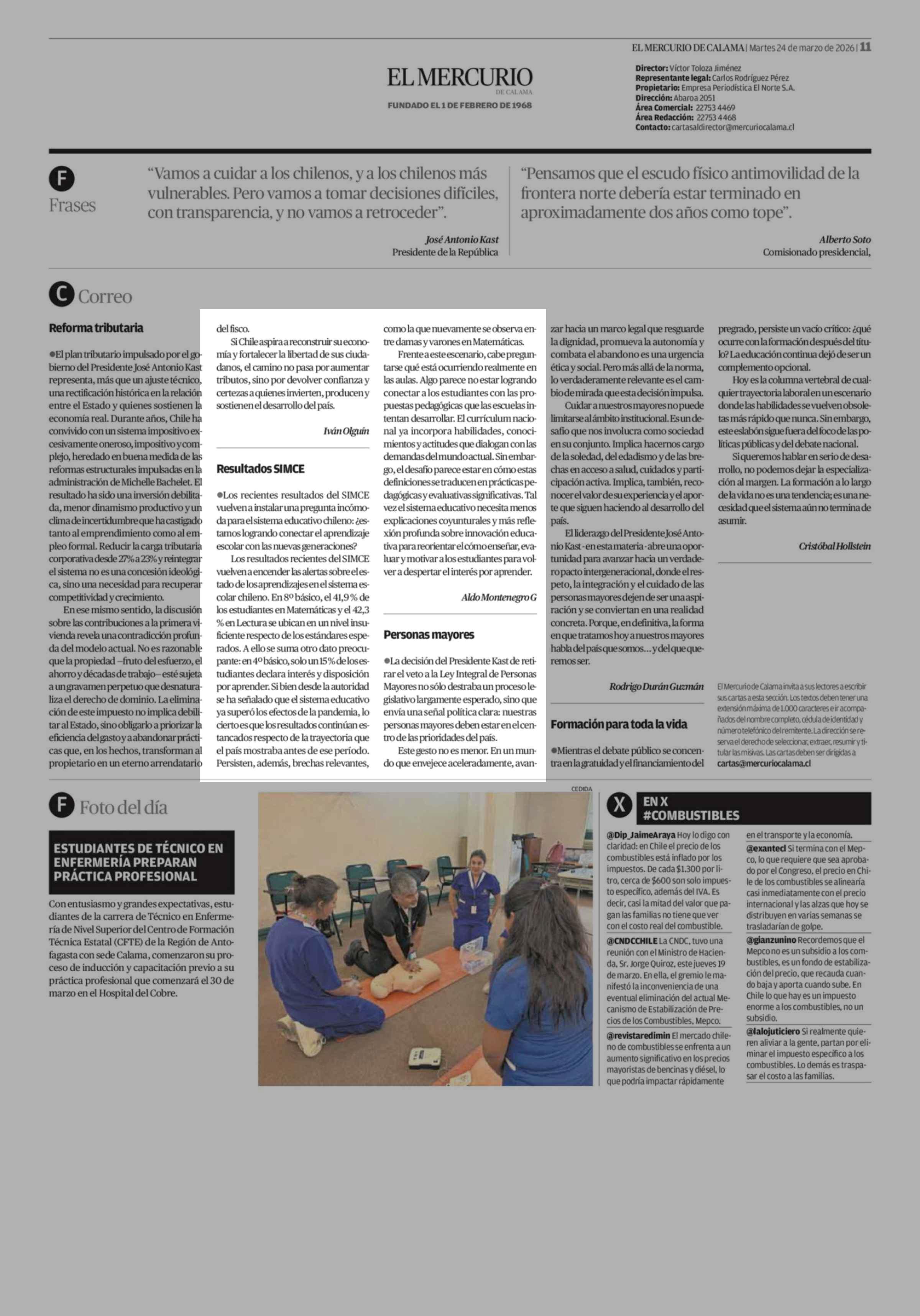 Cartas: Resultados SIMCE 24-03-2026 El Mercurio de Calama |