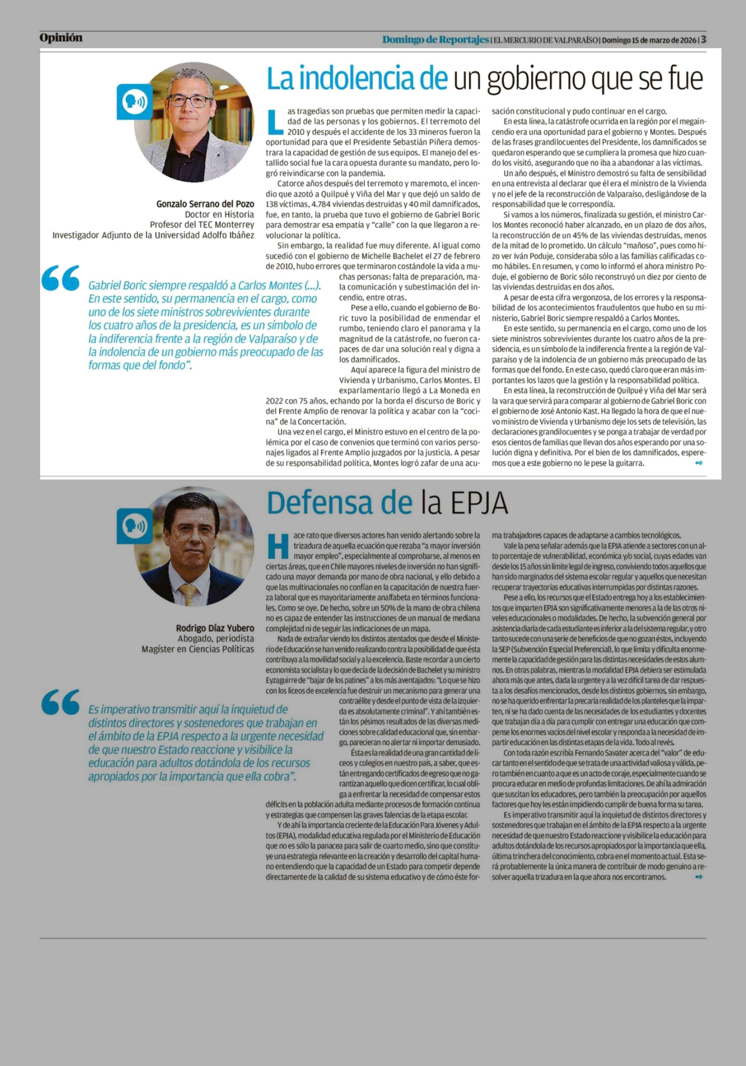 Columnas de Opinión: La indolencia de un gobierno que se fue 15-03-2026 El Mercurio de Valparaíso |