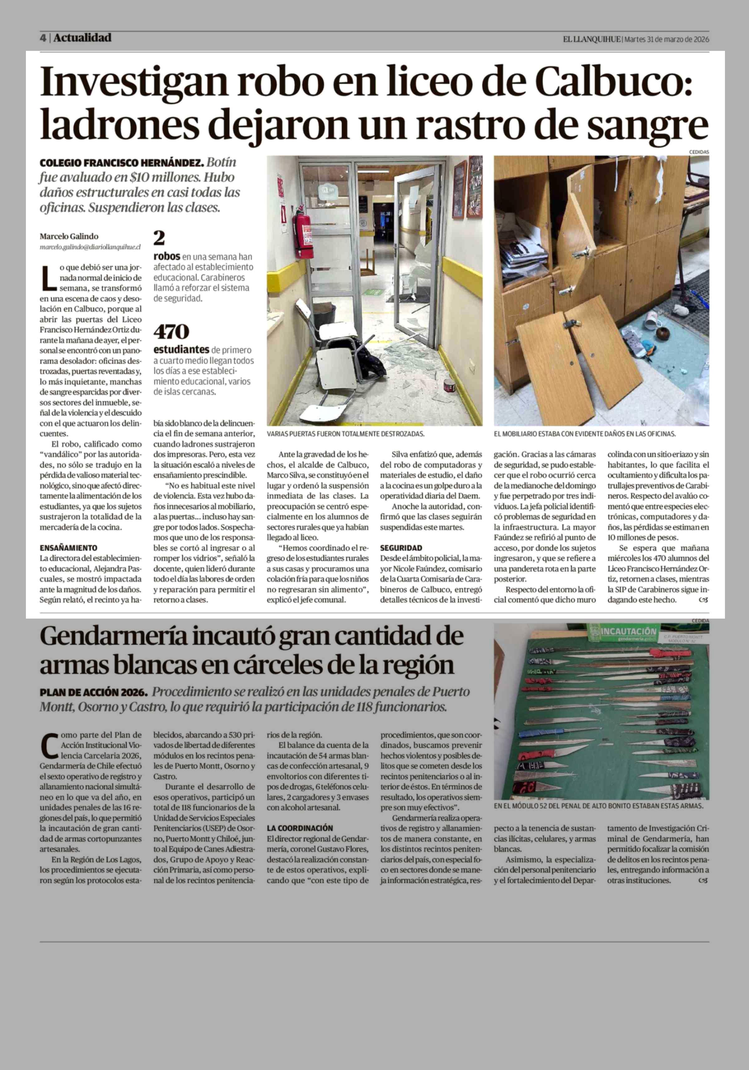 Investigan robo en liceo de Calbuco: ladrones dejaron un rastro de sangre 31-03-2026 El Llanquihue |