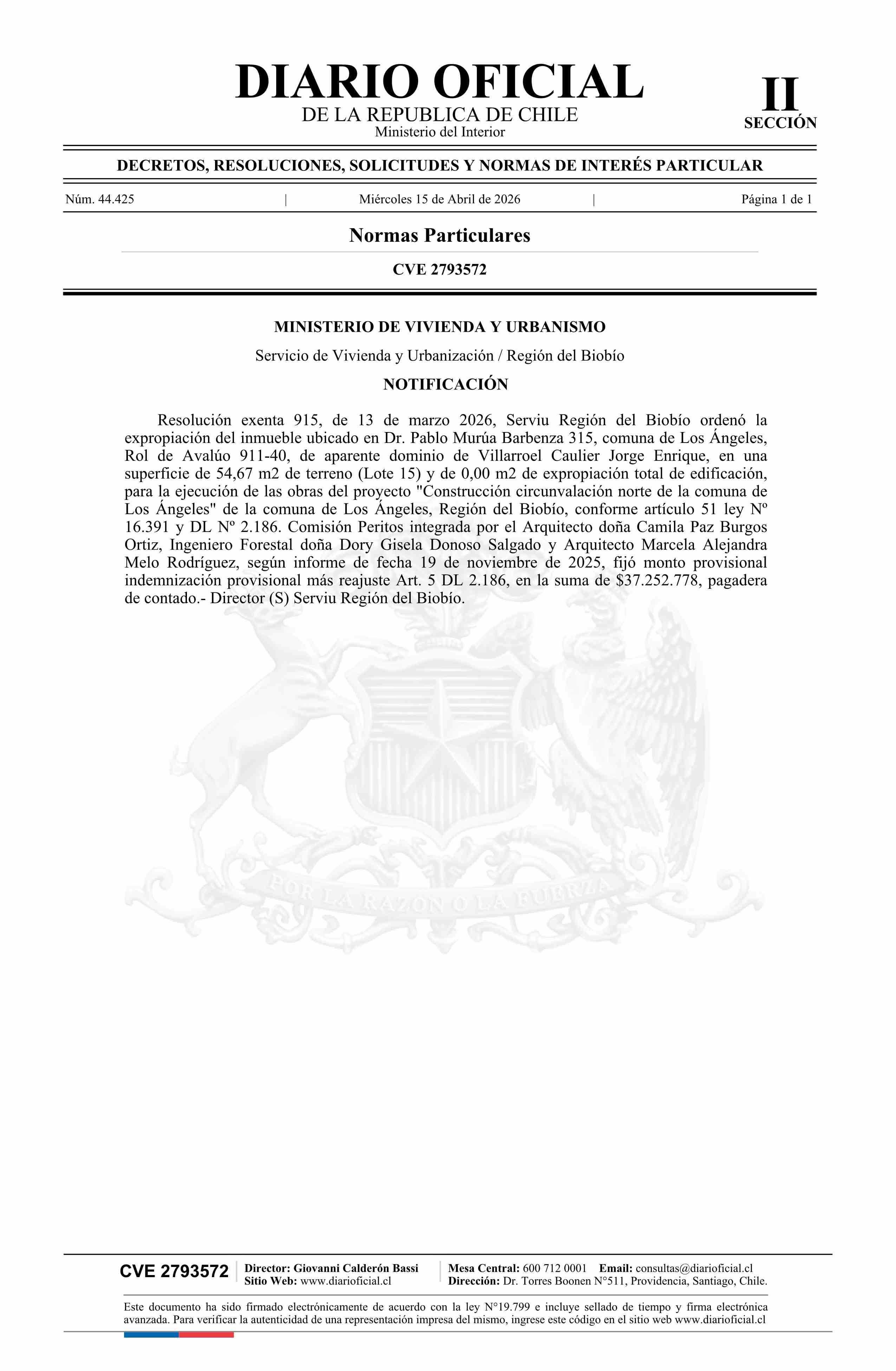 Extracto de resolución exenta número 915, de 2026.- Ordena expropiación de inmueble que indica 15-04-2026 Diario Oficial Edición Electrónica |