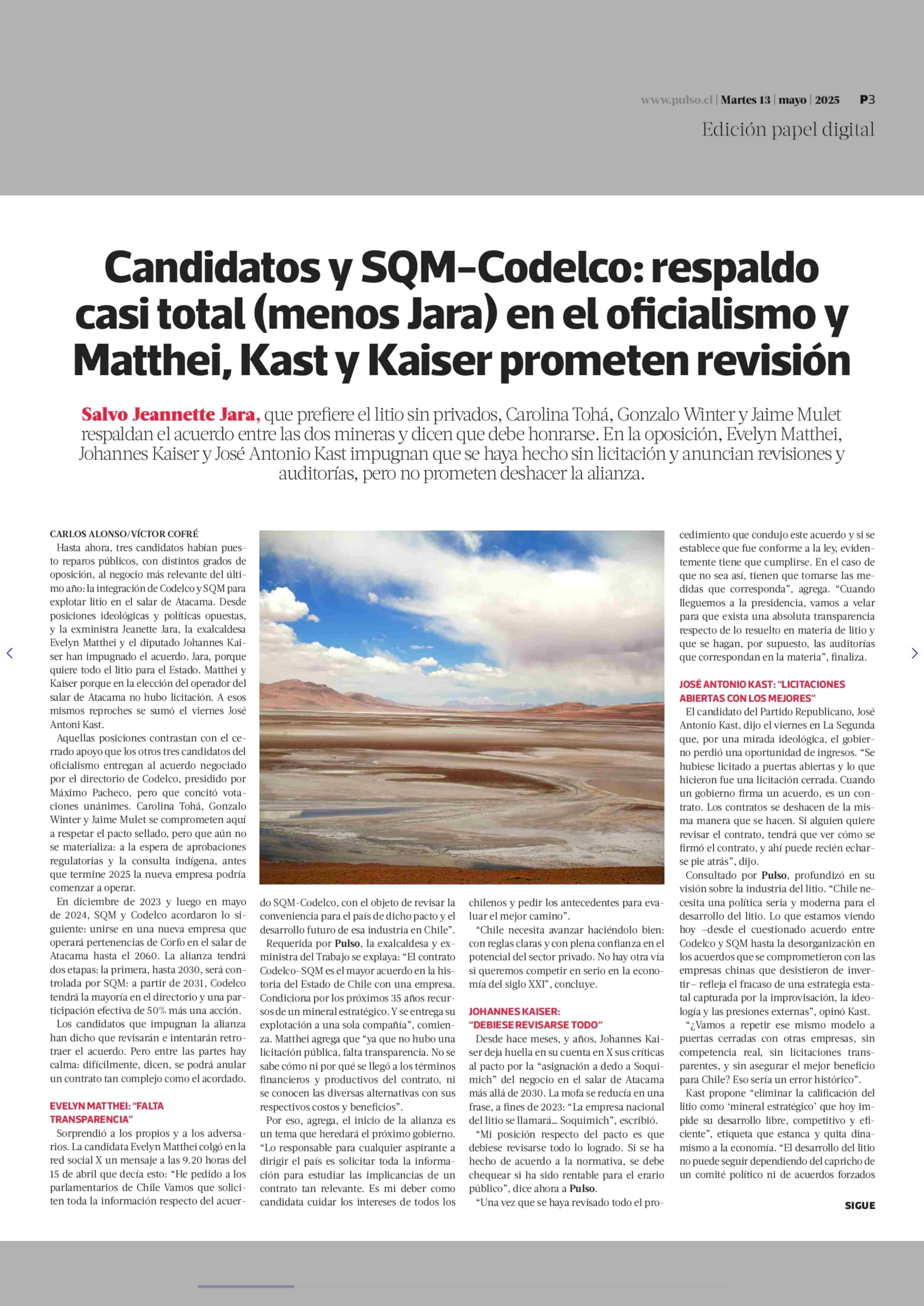 Candidatos y SQM-Codelco: respaldo casi total (menos Jara) en el oficialismo y Matthei, Kast y Kaiser prometen revisión 13-05-2025 La Tercera |
