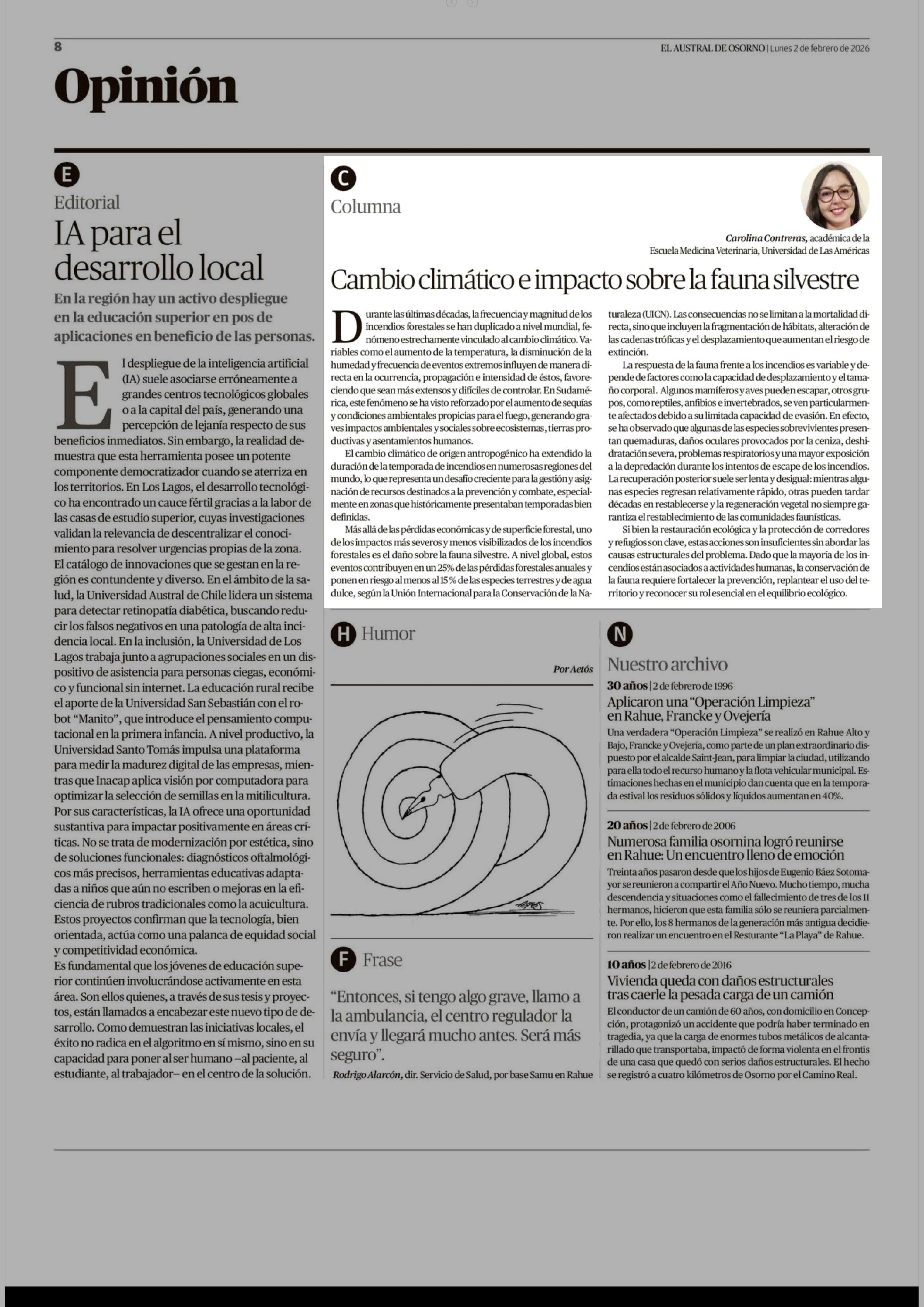 Columnas de Opinión: Cambio climático e impacto sobre la fauna silvestre 02-02-2026 El Austral de Osorno |