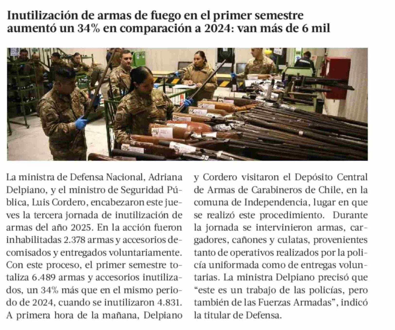 Inutilización de armas de fuego en el primer semestre aumentó un 34% en comparación a 2024: van más de 6 mil 11-07-2025 La Tercera |