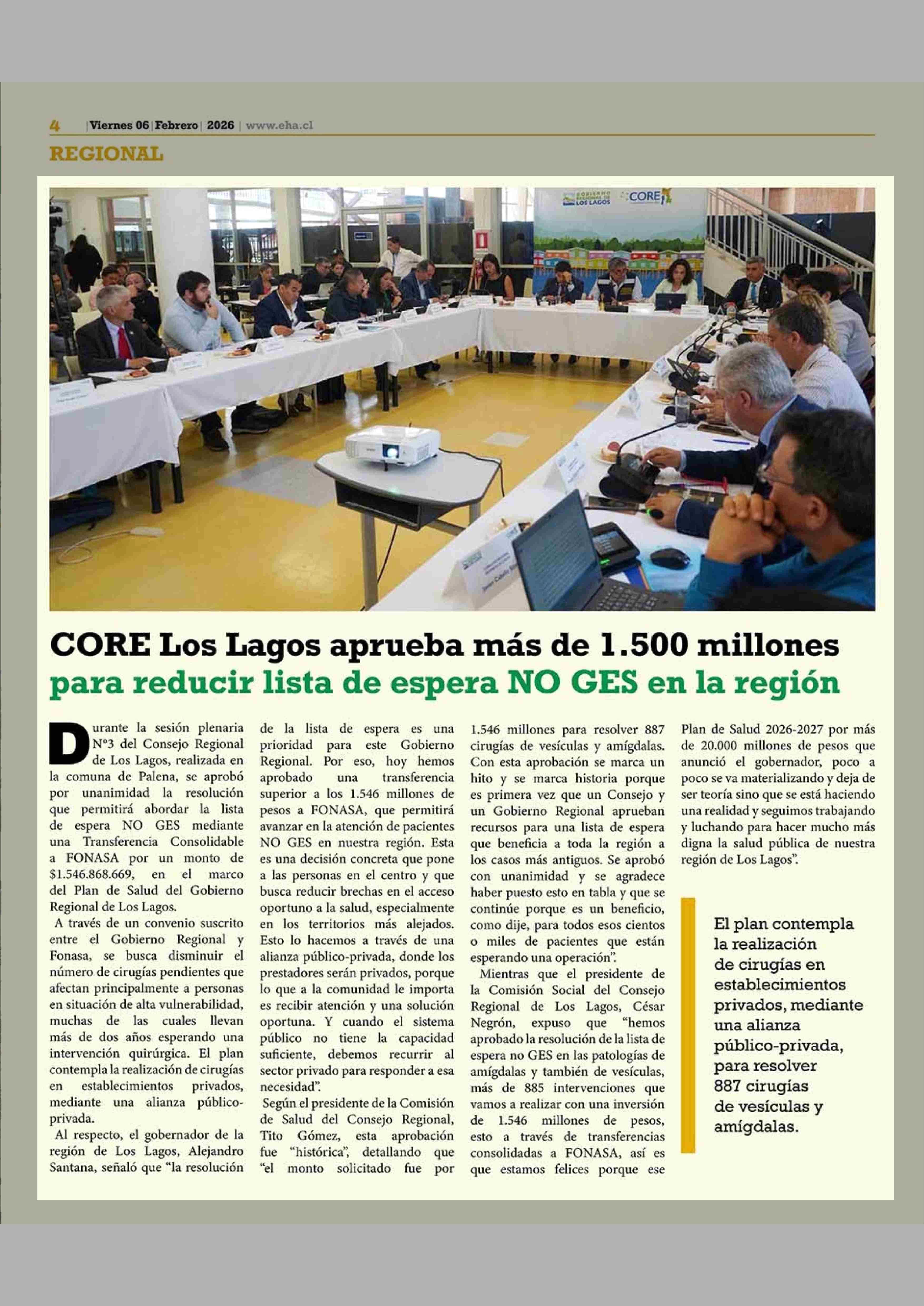 CORE Los Lagos aprueba más de 1.500 millones para reducir lista de espera NO GES en la región 06-02-2026 El Heraldo Austral |