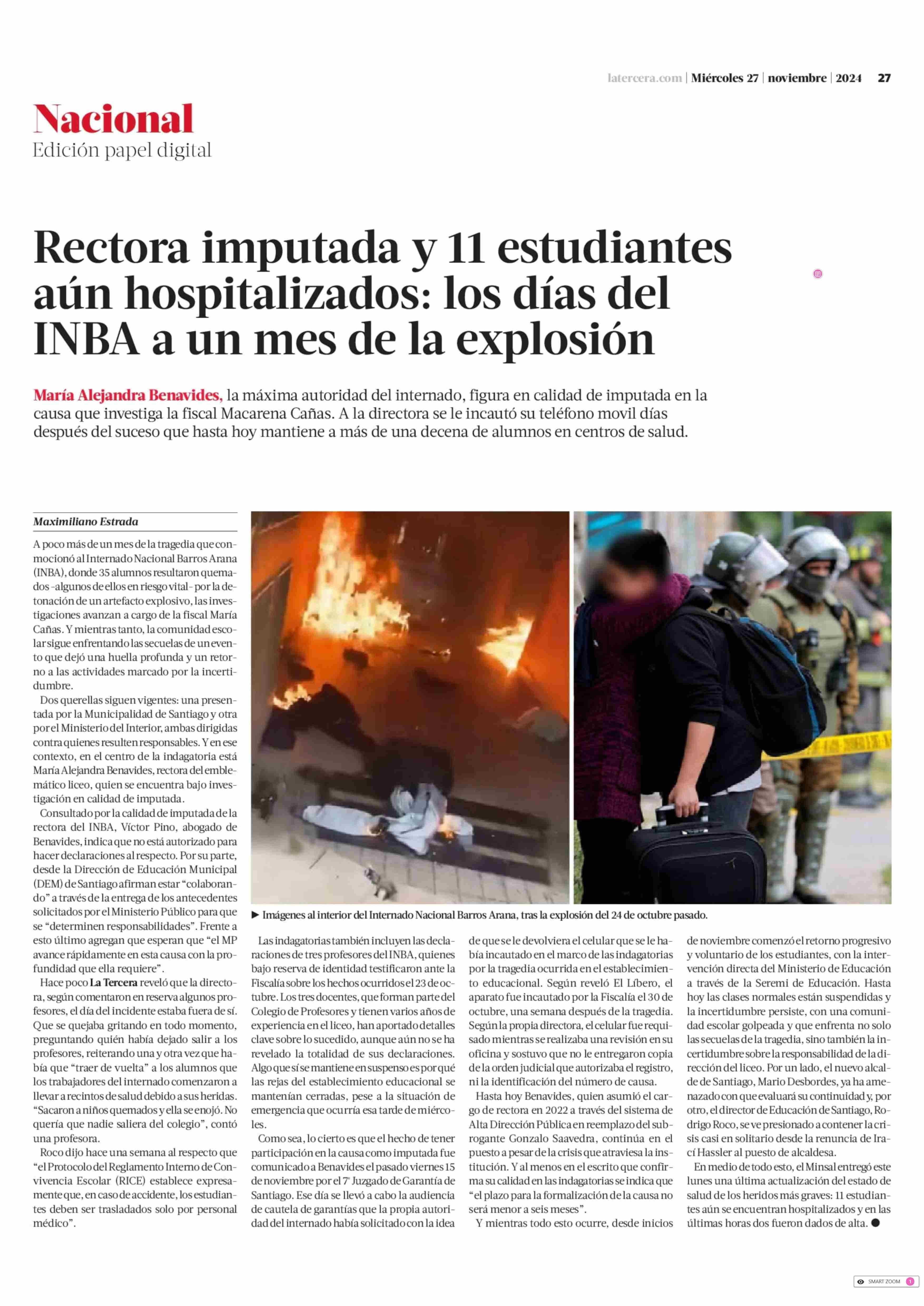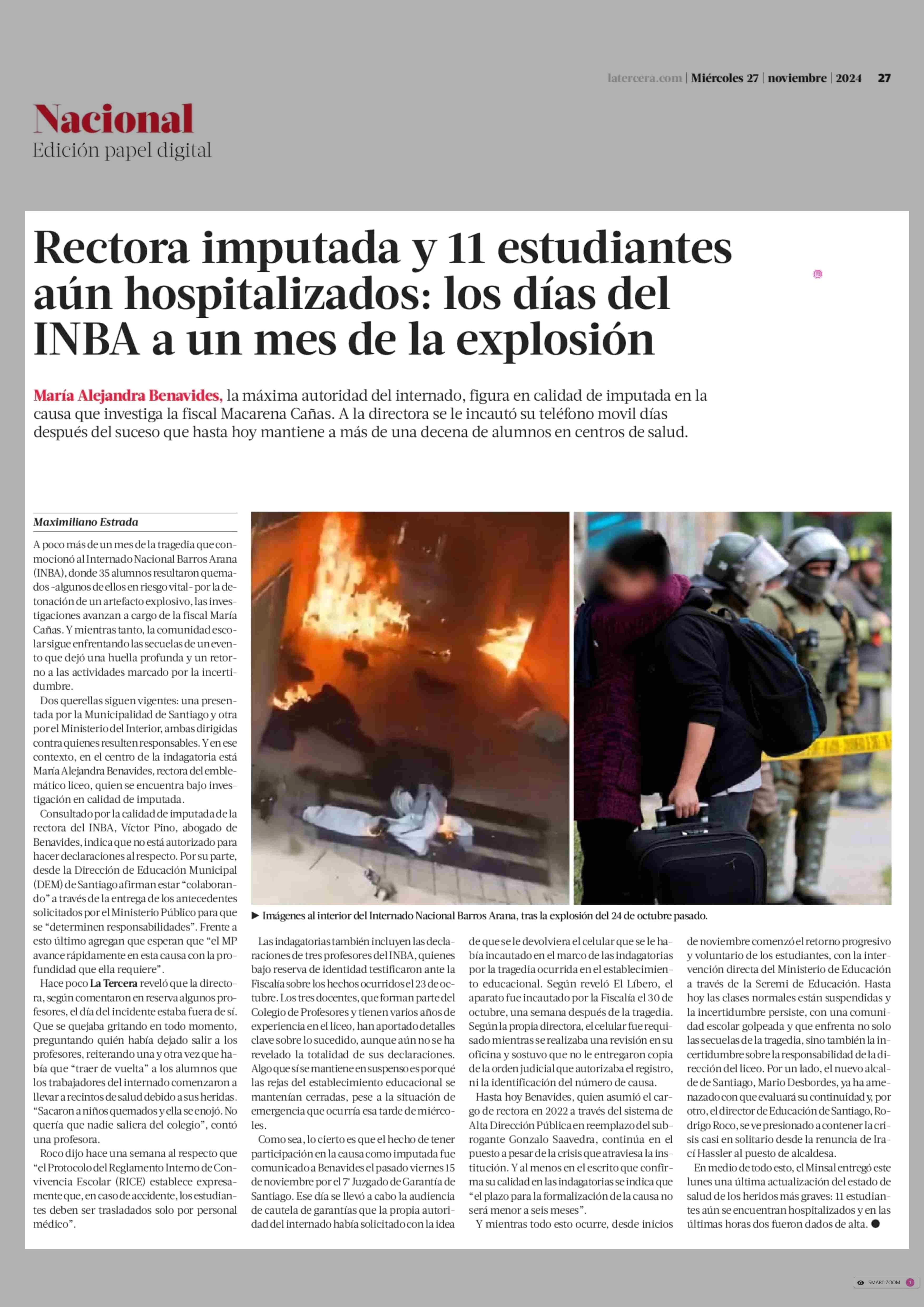 Rectora imputada y 11 estudiantes aún hospitalizados: los días del INBA a un mes de la explosión 27-11-2024 La Tercera |