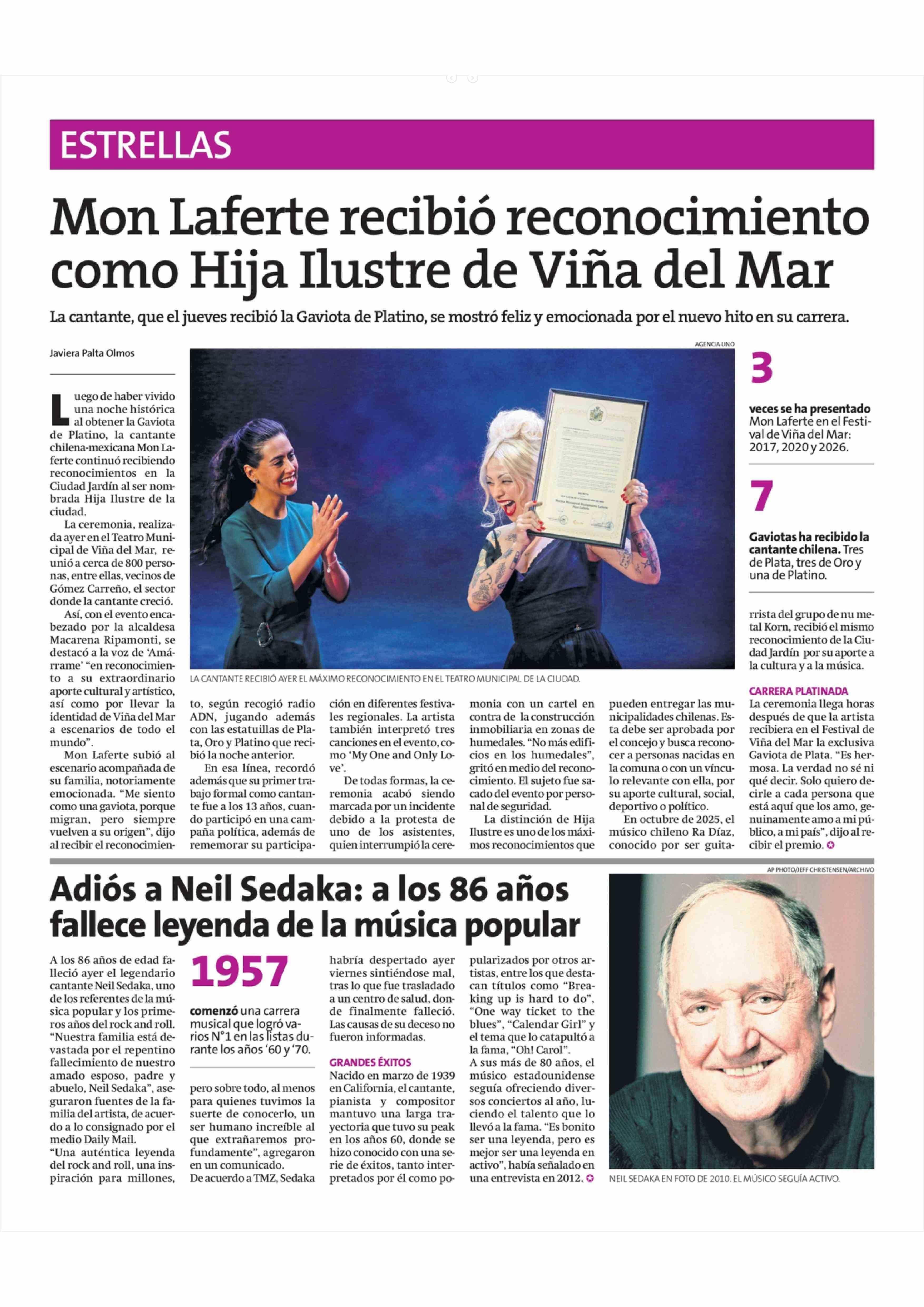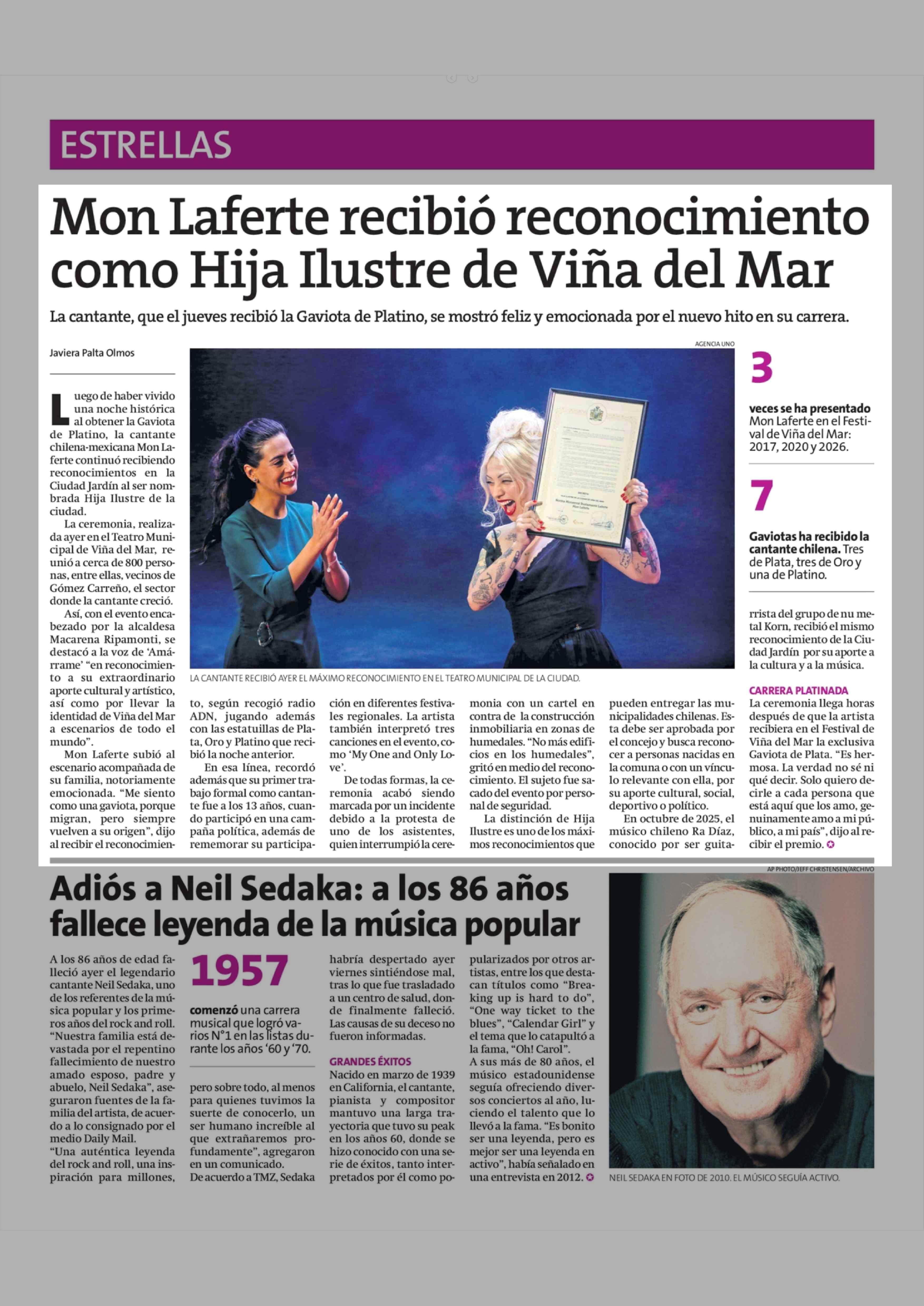 Mon Laferte recibió reconocimiento como Hija Ilustre de Viña del Mar 28-02-2026 La Estrella de Concepción |