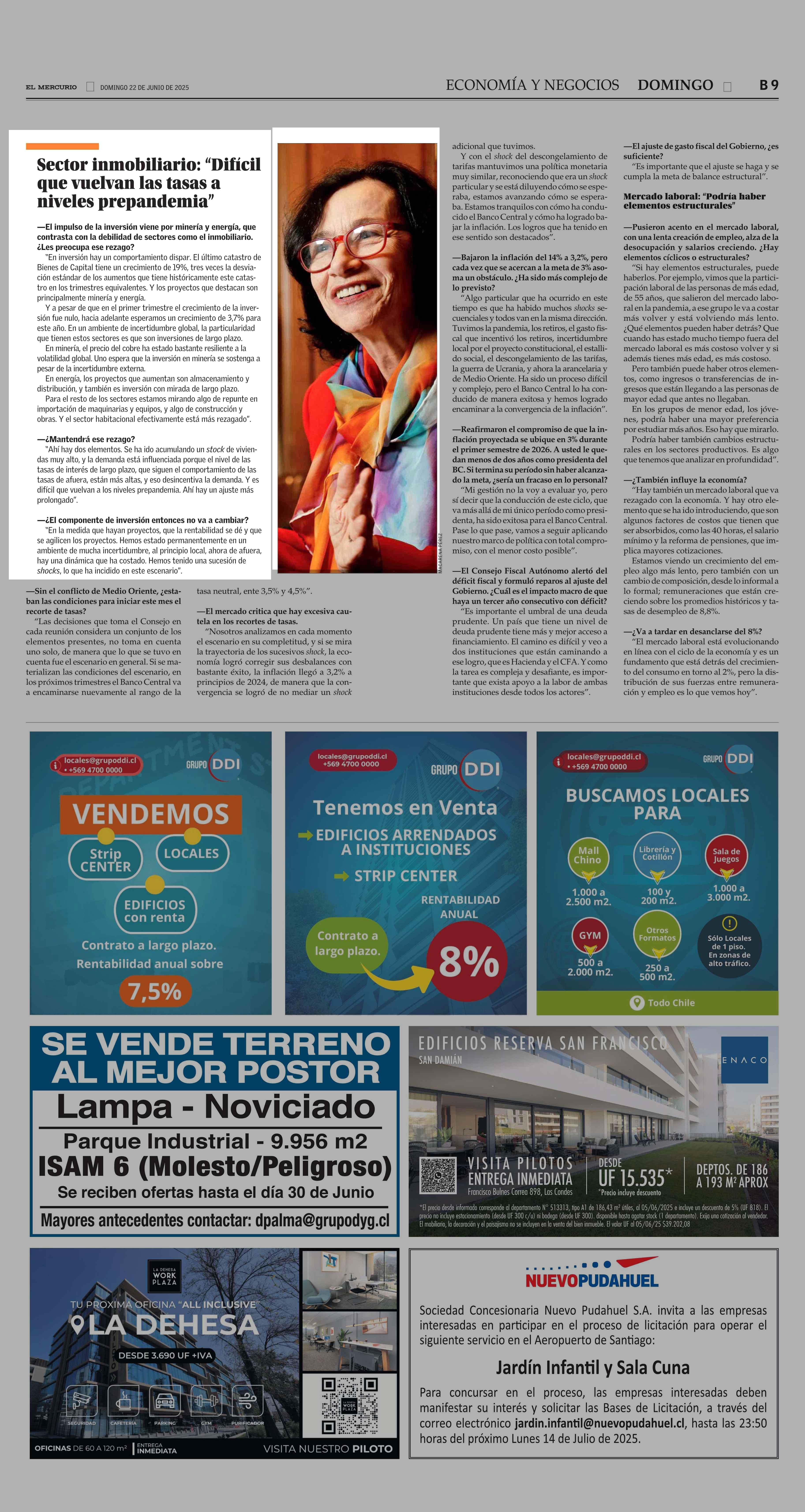 Sector inmobiliario: “Difícil que vuelvan las tasas a niveles prepandemia” 22-06-2025 El Mercurio |