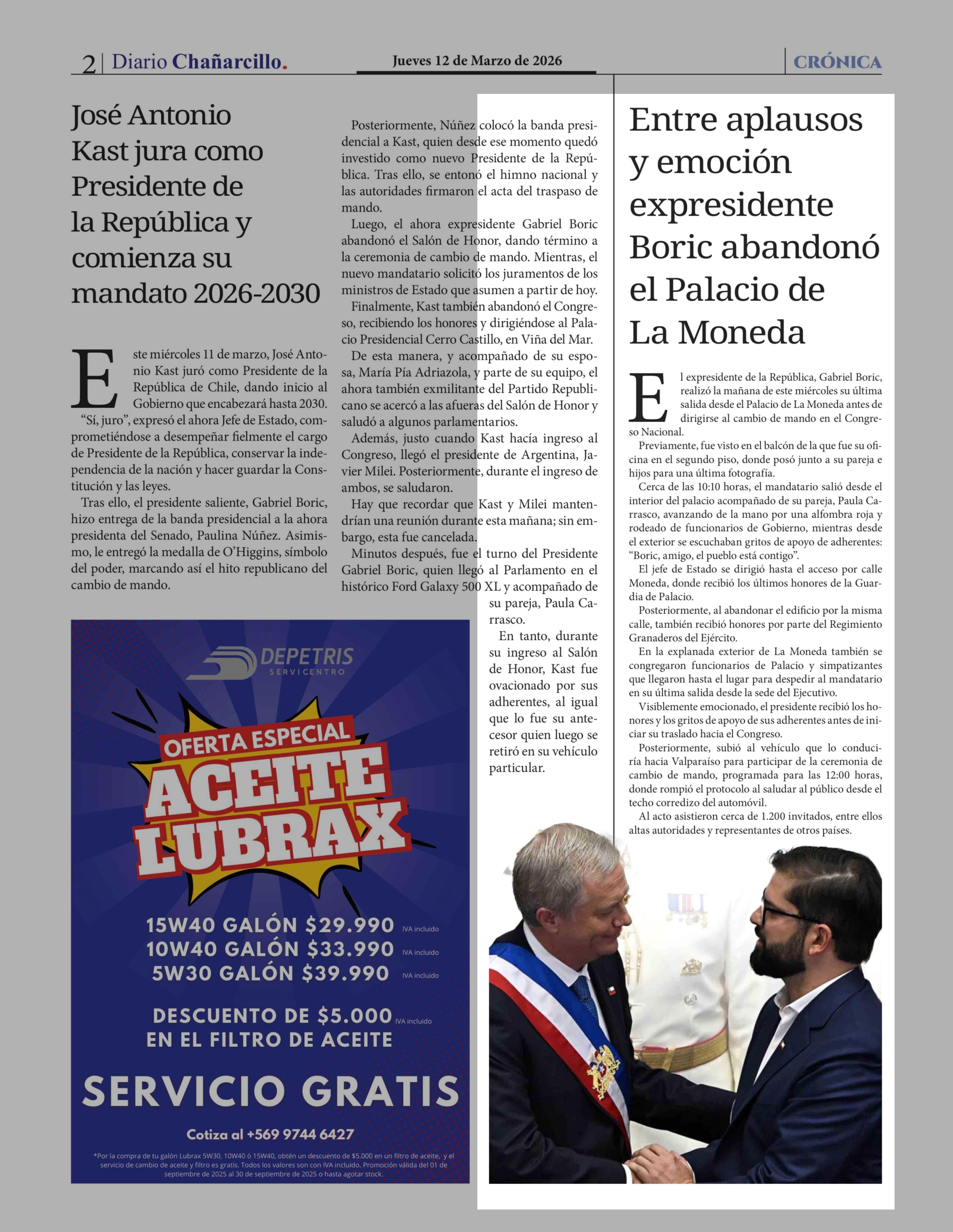 Entre aplausos y emoción expresidente Boric abandonó el Palacio de La Moneda 12-03-2026 Diario Chañarcillo |