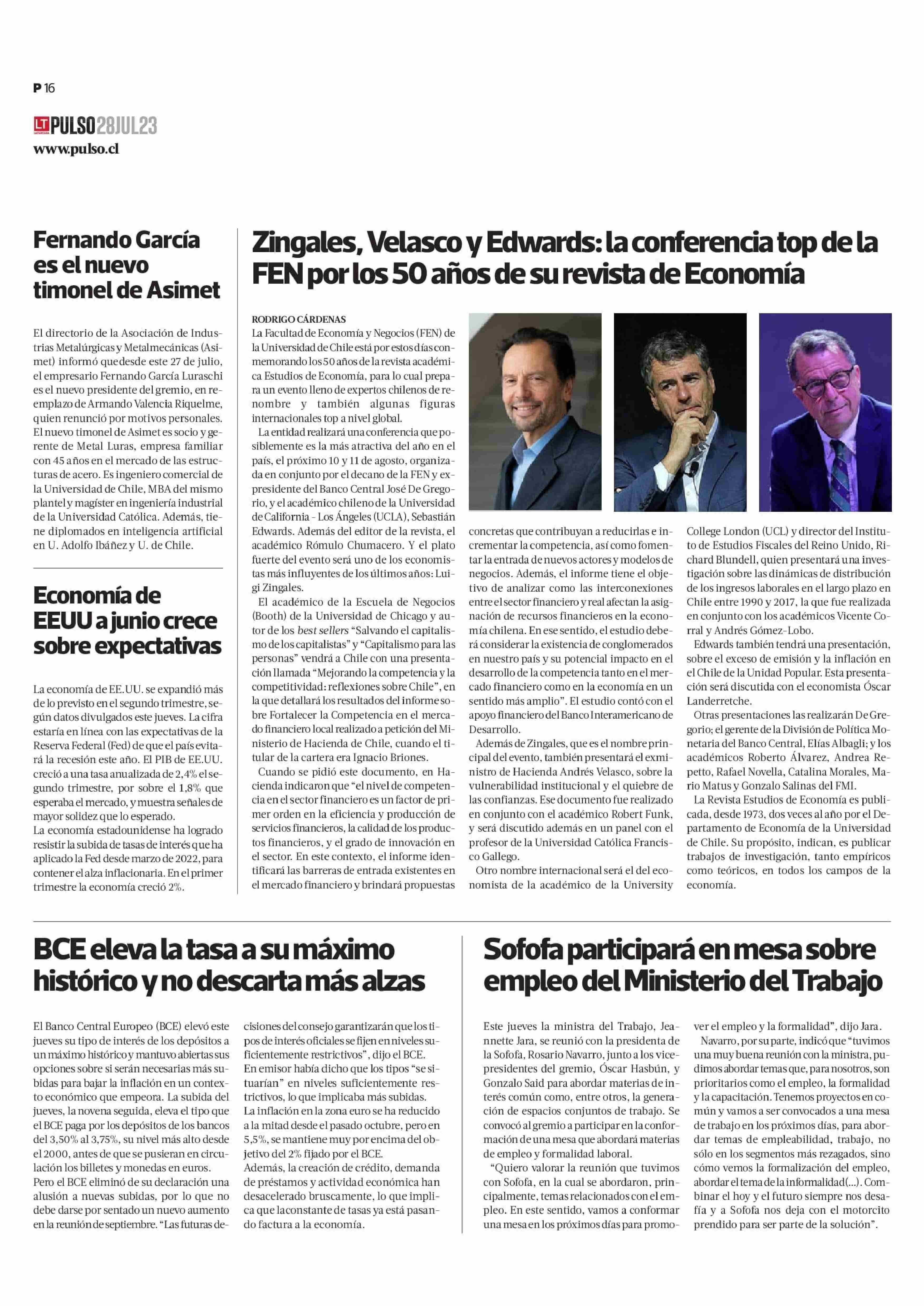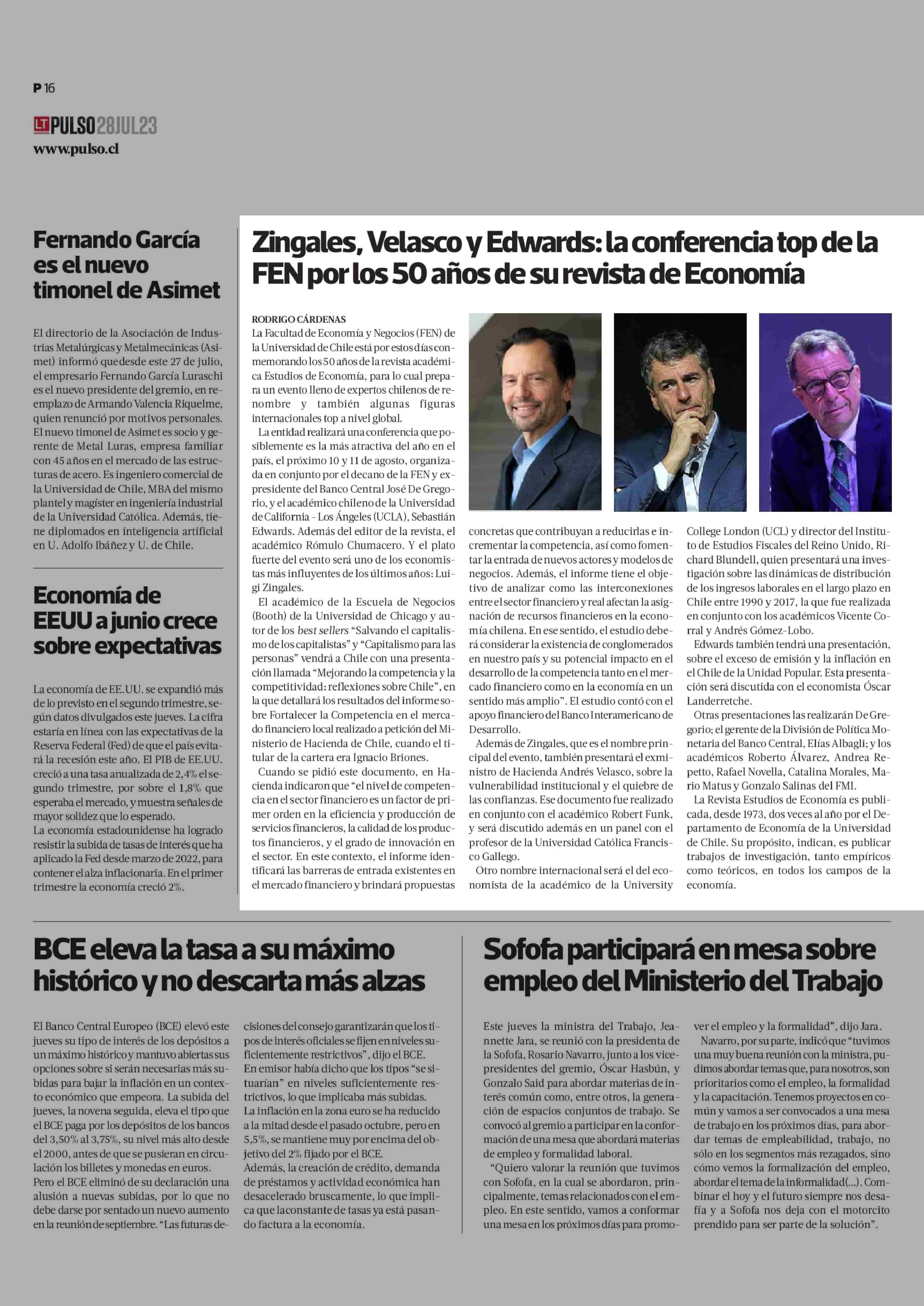 Zingales, Velasco y Edwards: la conferencia top de la FEN porlos 50 años de su revista de Economía 28-07-2023 La Tercera |