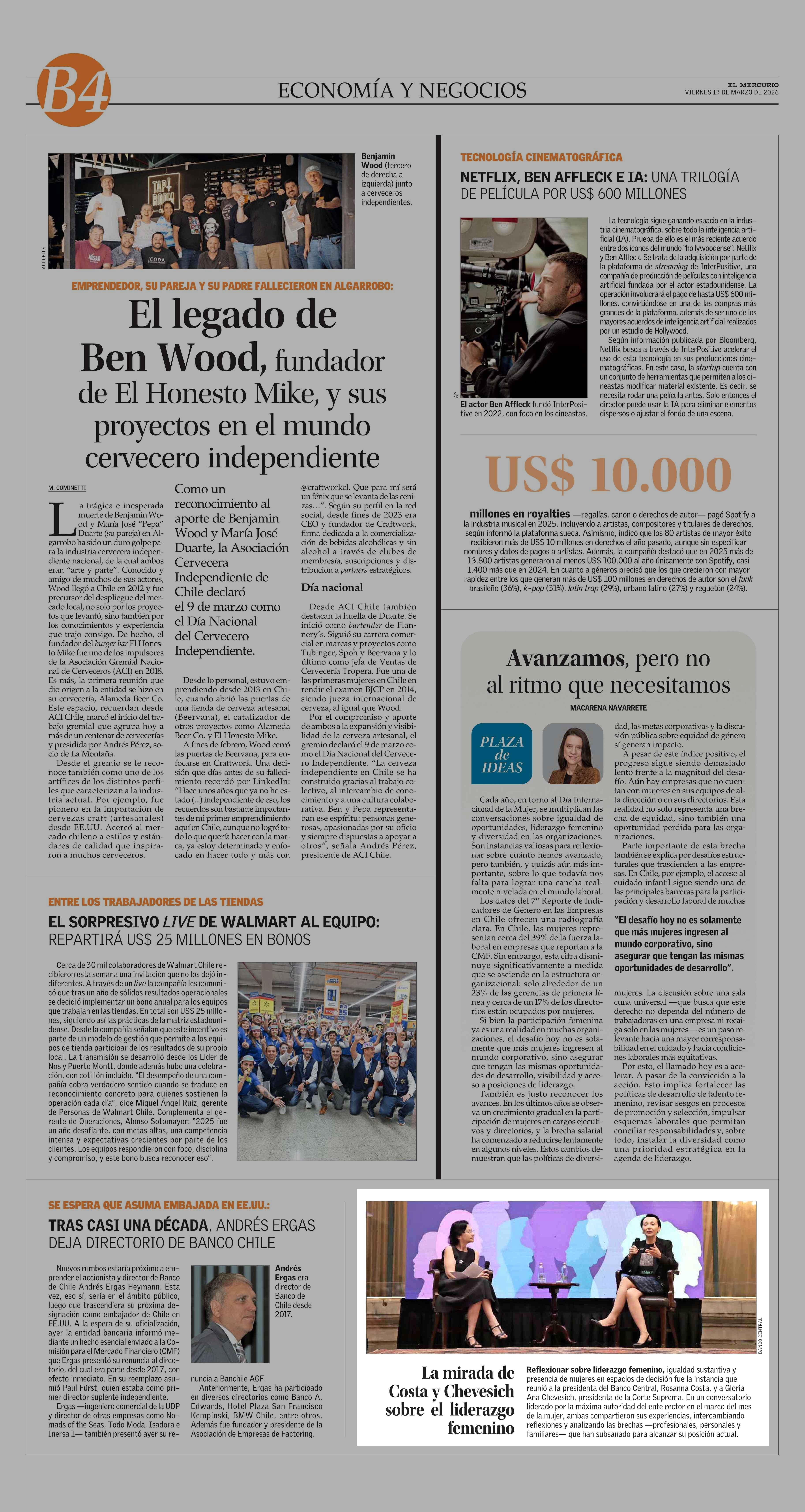 La mirada de Costa y Chevesich sobre el liderazgo femenino 13-03-2026 El Mercurio |