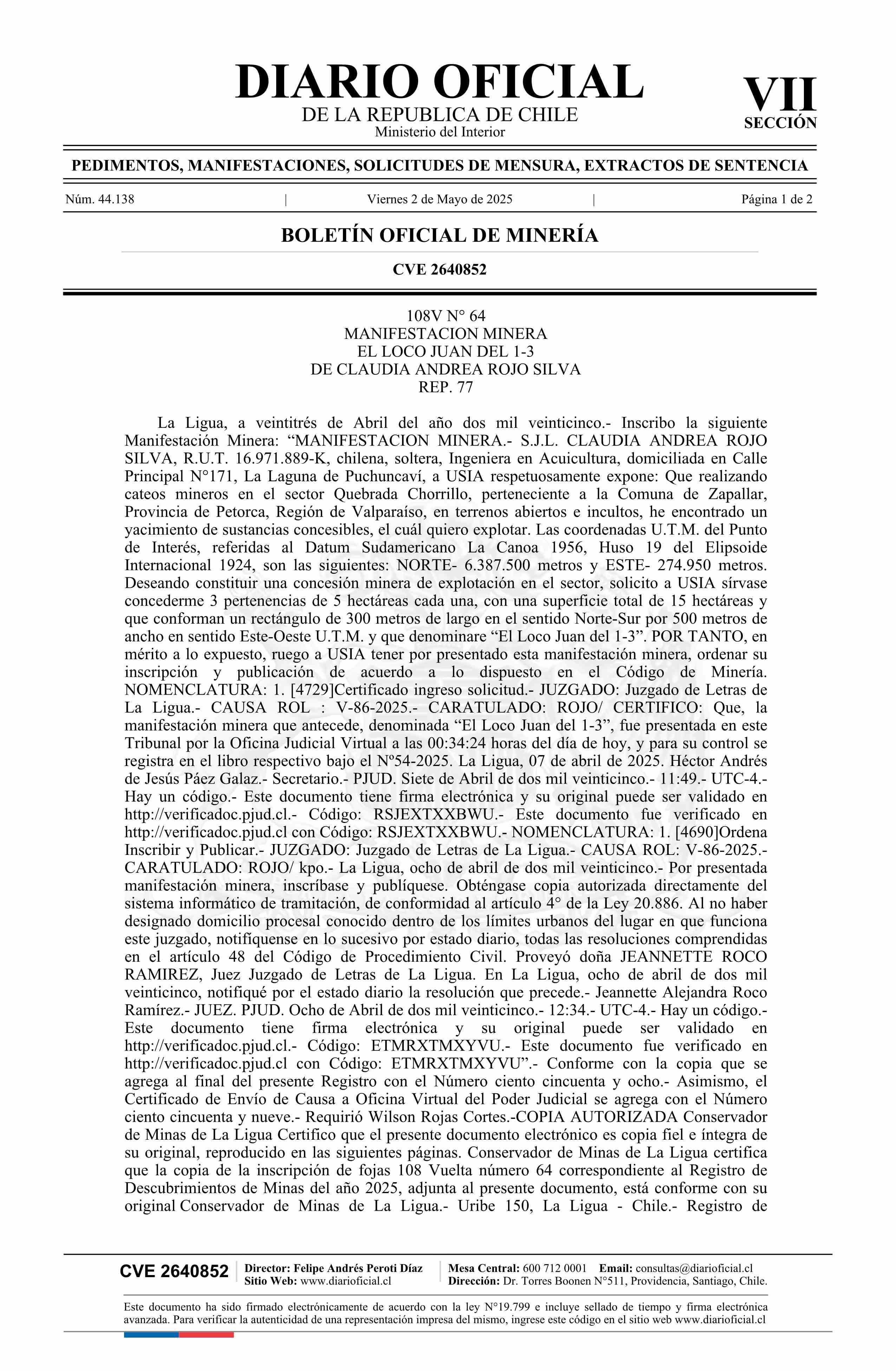 El Loco Juan del 1-3 / Rojo Silva Claudia Andrea 02-05-2025 DIARIO OFICIAL CHILE - BOLETÍN OFICIAL DE MINERÍA |