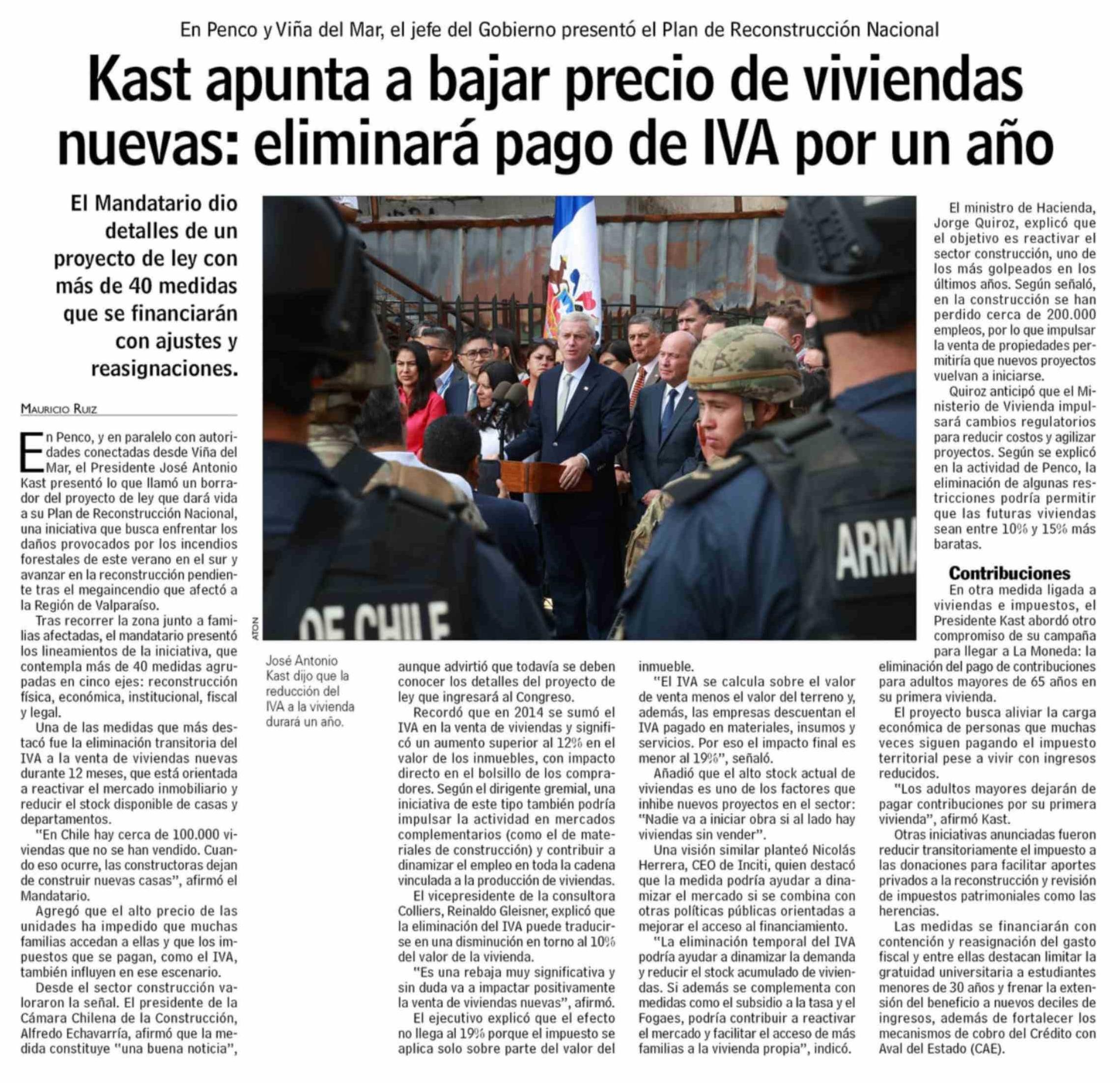 | Título: | Kast apunta a bajar precio de viviendas nuevas: eliminara pago de IVA por un año |