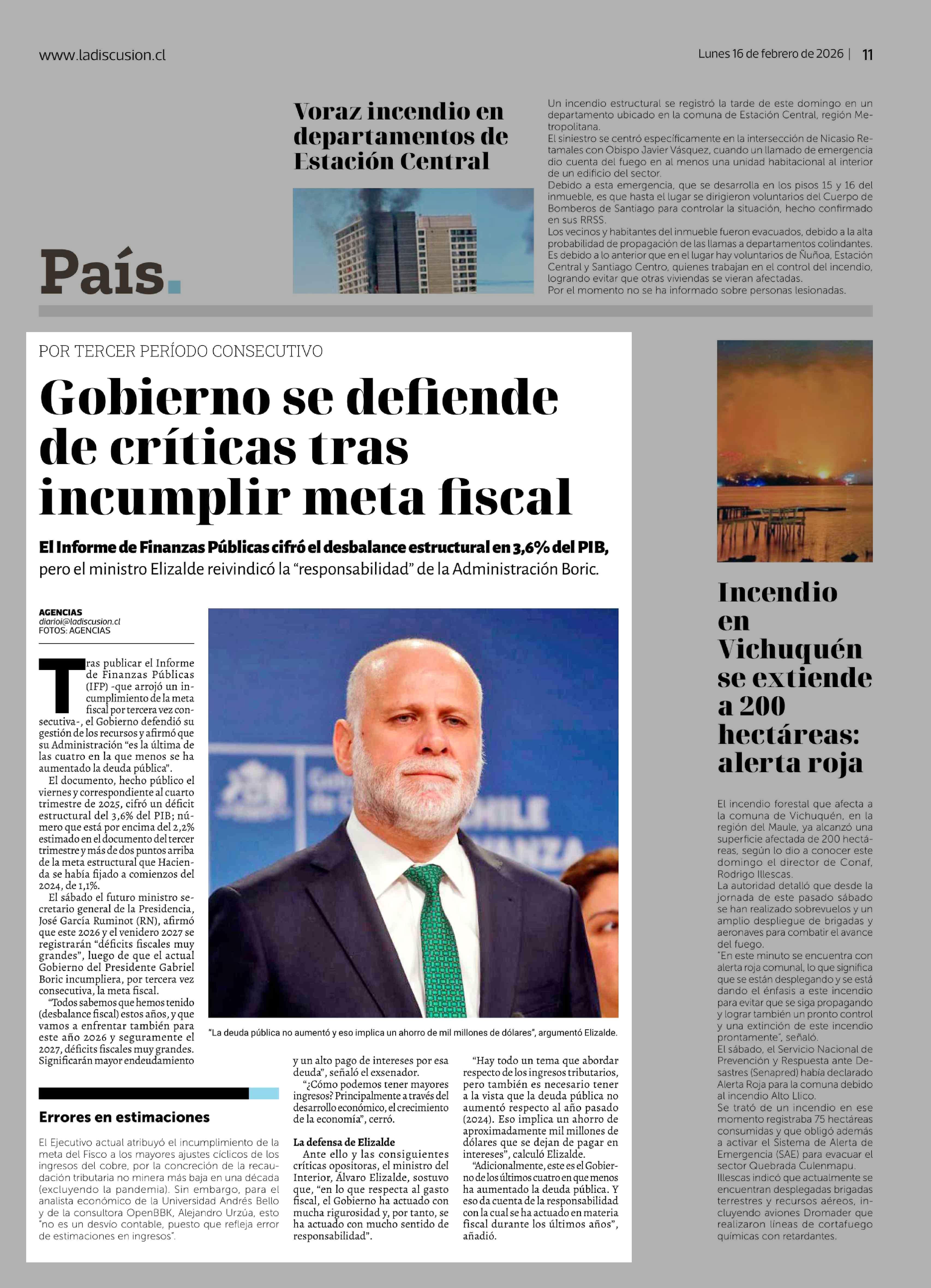 Gobierno se defiende de críticas tras incumplir meta fiscal 16-02-2026 La Discusión |