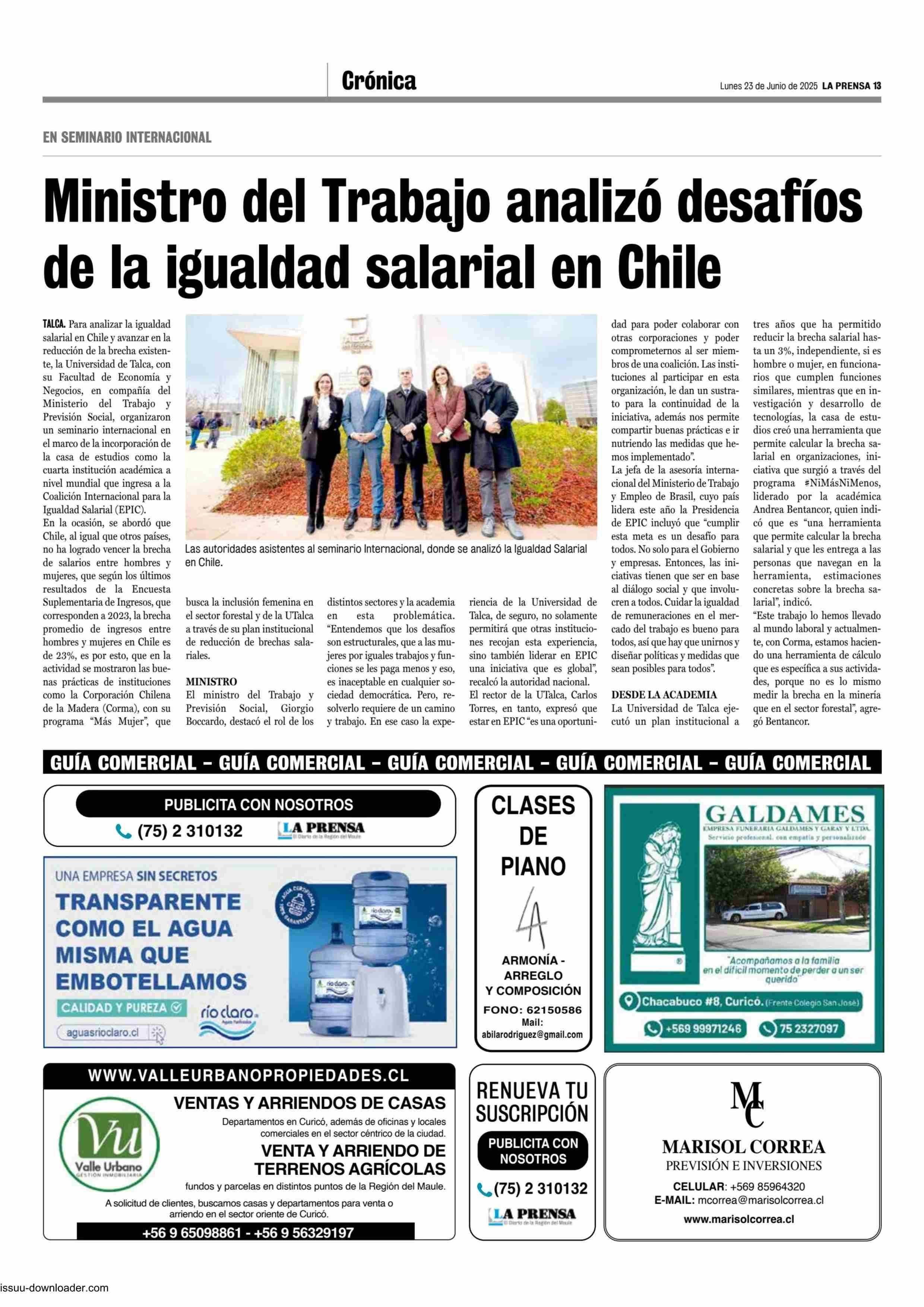 Ministro del Trabajo analizó desafíos de la igualdad salarial en Chile 23-06-2025 La Prensa de Curicó |
