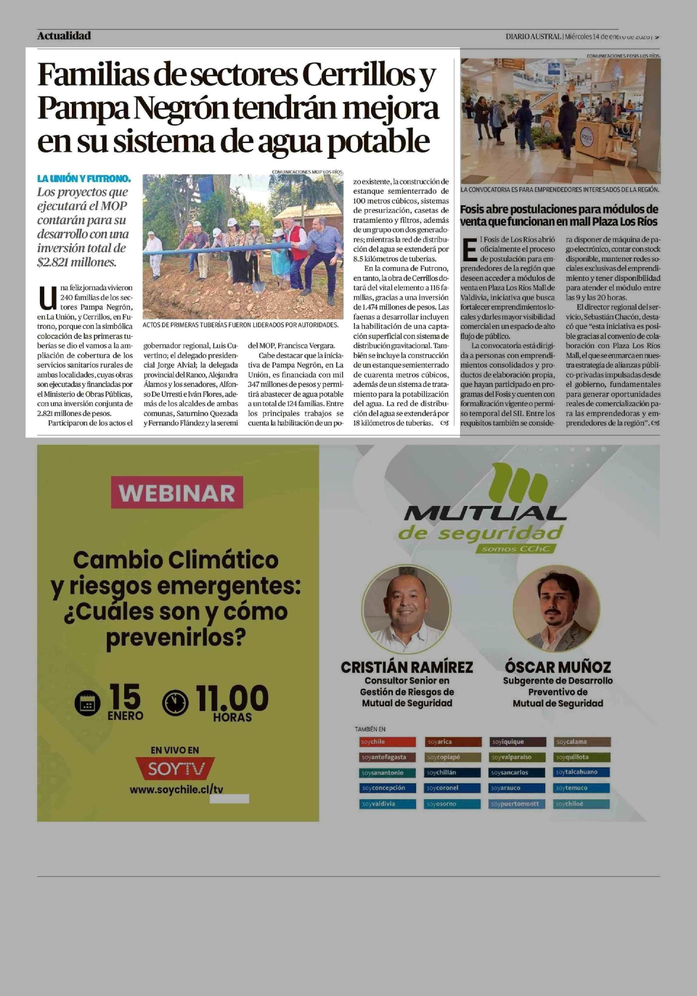Familias de sectores Cerrillos y Pampa Negrón tendrán mejora en su sistema de agua potable 14-01-2026 Diario Austral Región de Los Ríos |