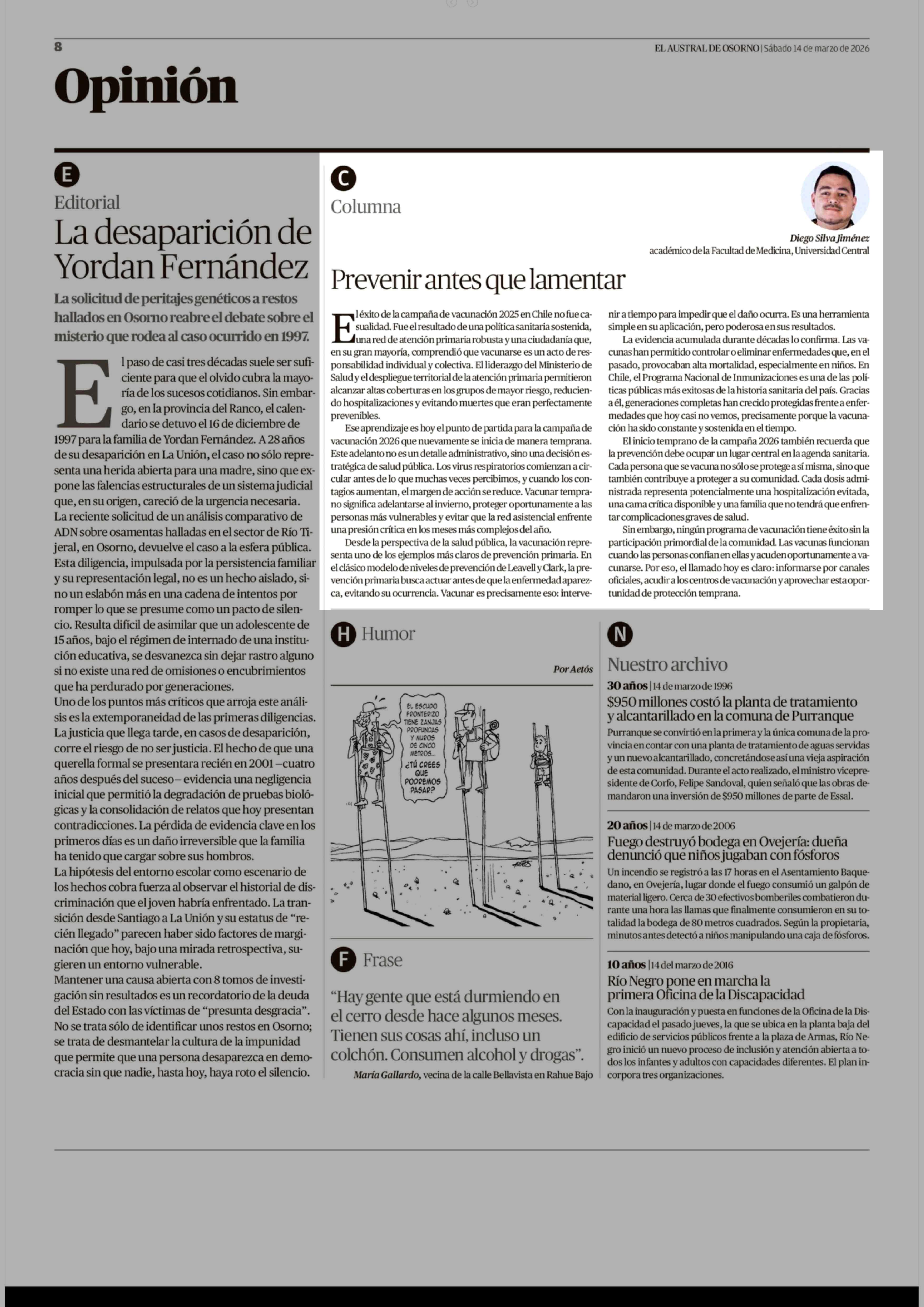 Columnas de Opinión: Prevenir antes que lamentar 14-03-2026 El Austral de Osorno |