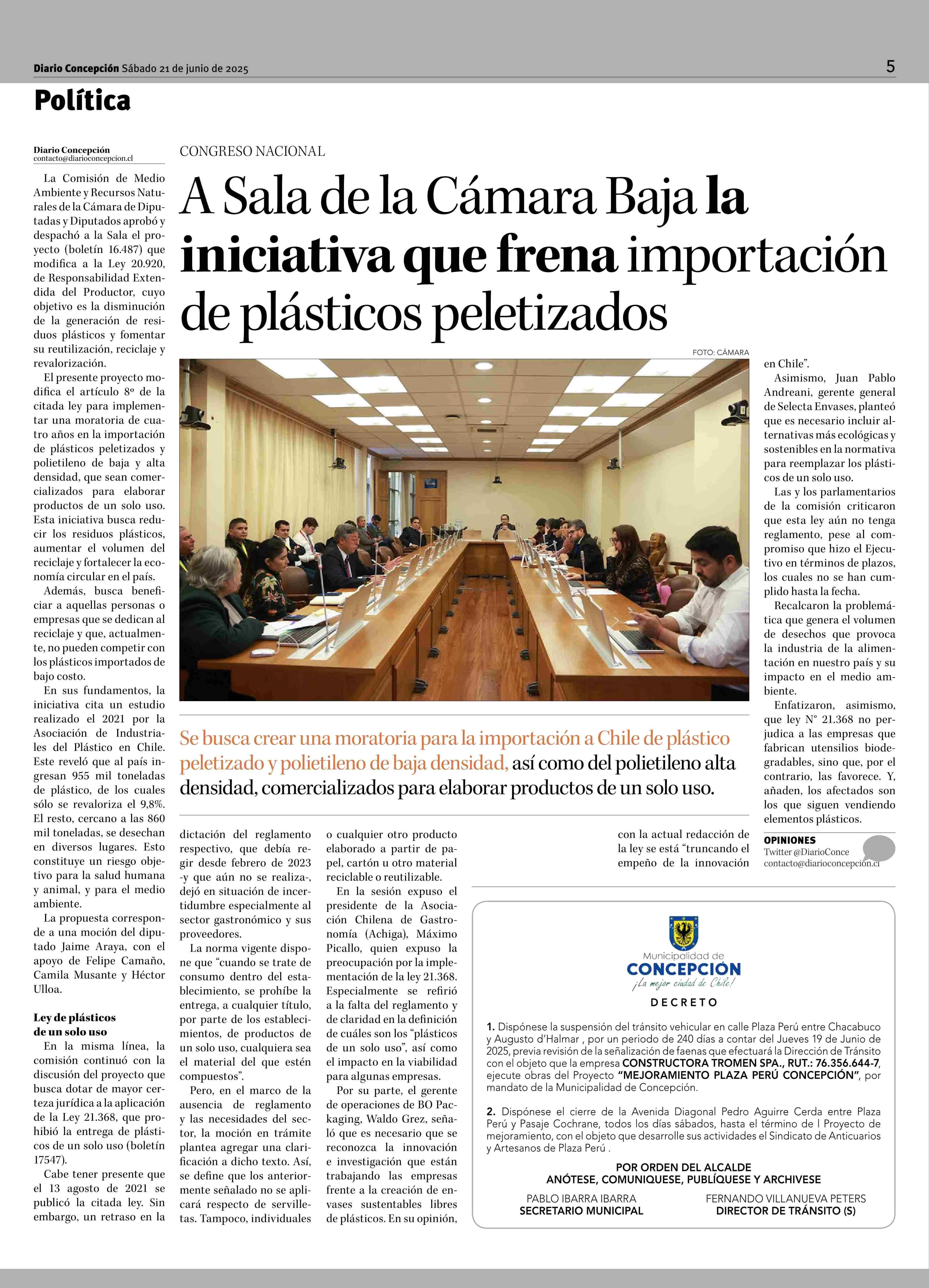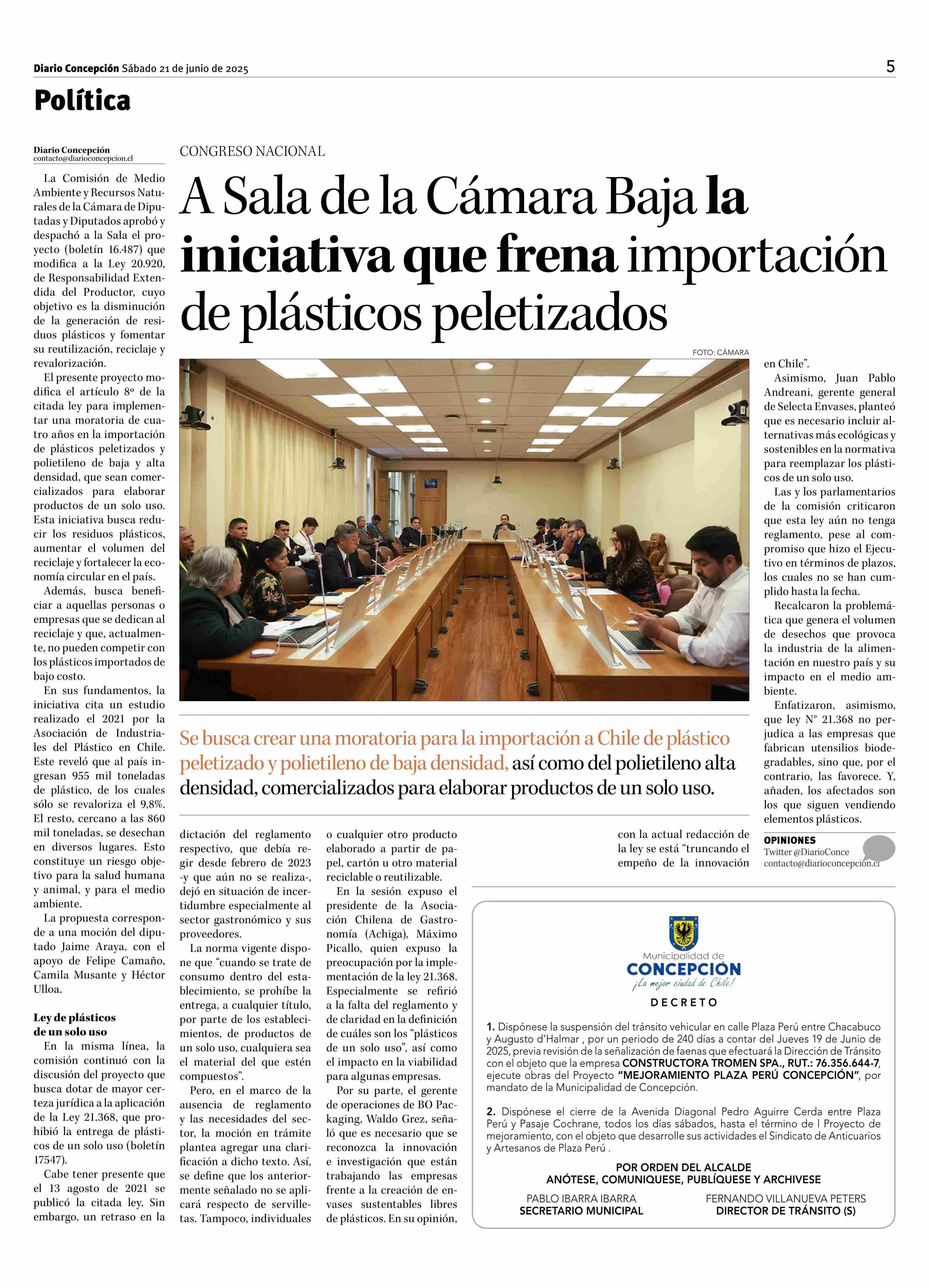 A Sala de la Cámara Baja la iniciativa que frena importación de plásticos peletizados 21-06-2025 Diario Concepción |