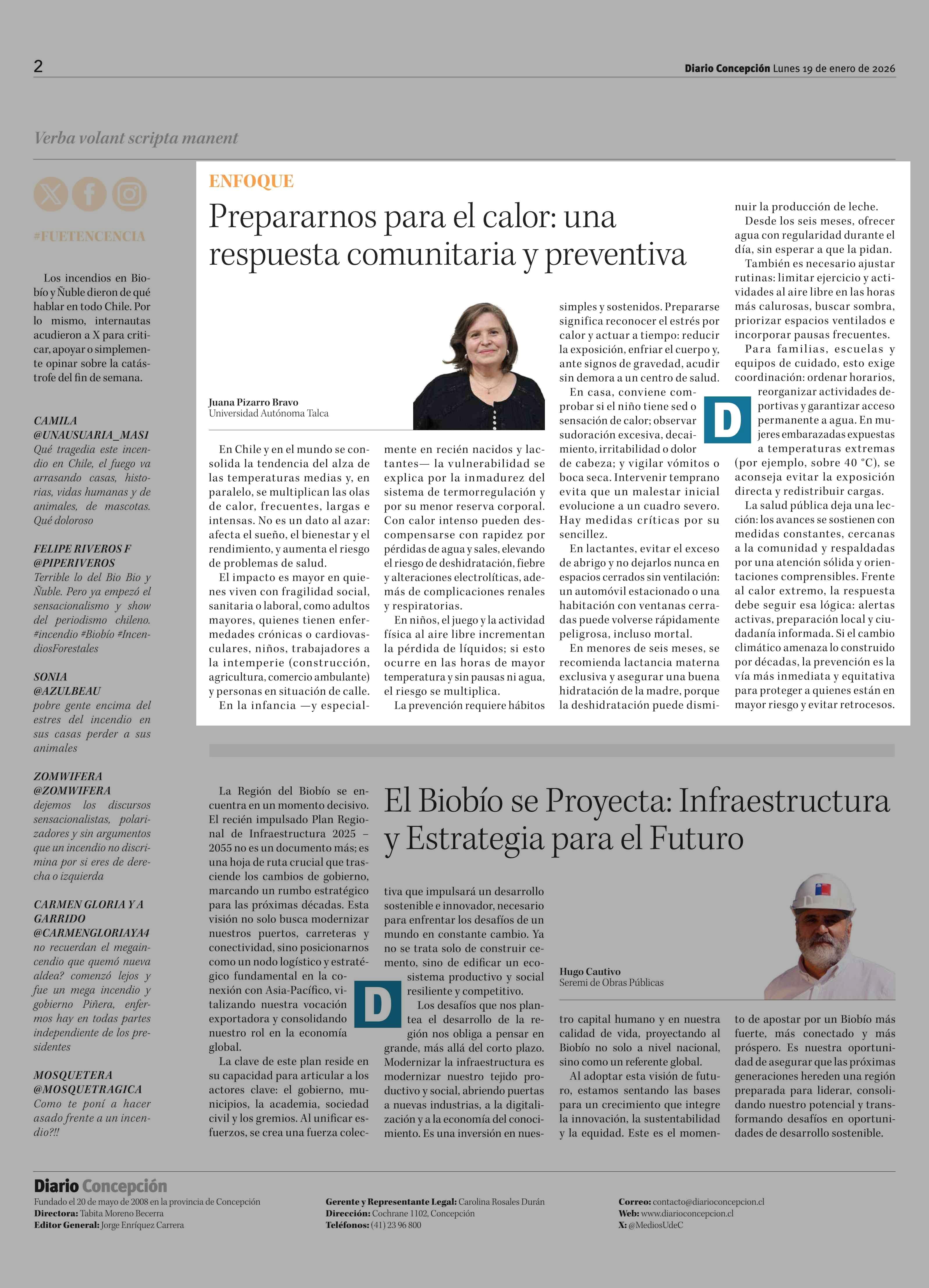 Columnas de Opinión: Prepararnos para el calor: una respuesta comunitaria y preventiva 19-01-2026 Diario Concepción |