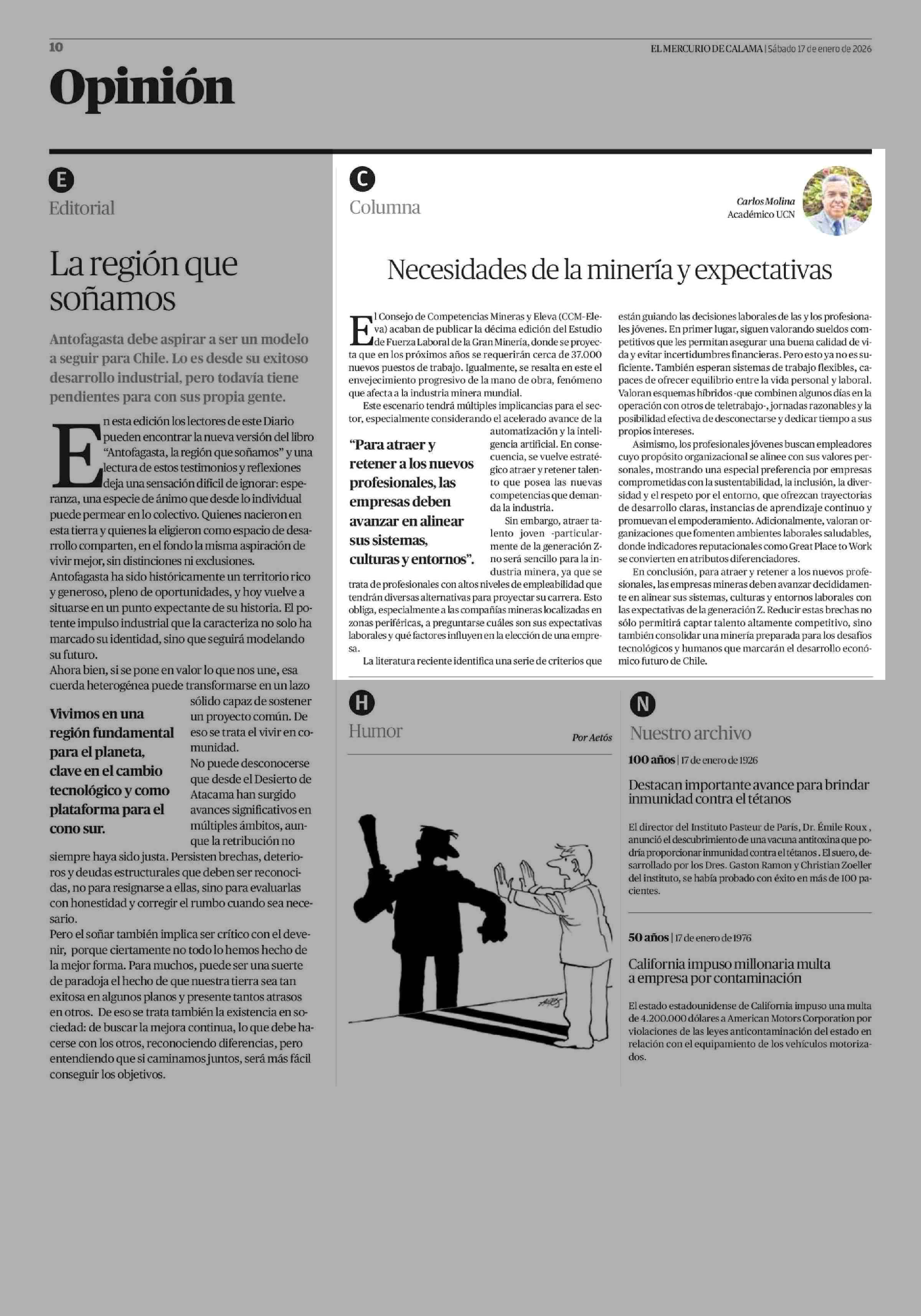 Columnas de Opinión: Necesidades de la minería y expectativas 17-01-2026 El Mercurio de Calama |