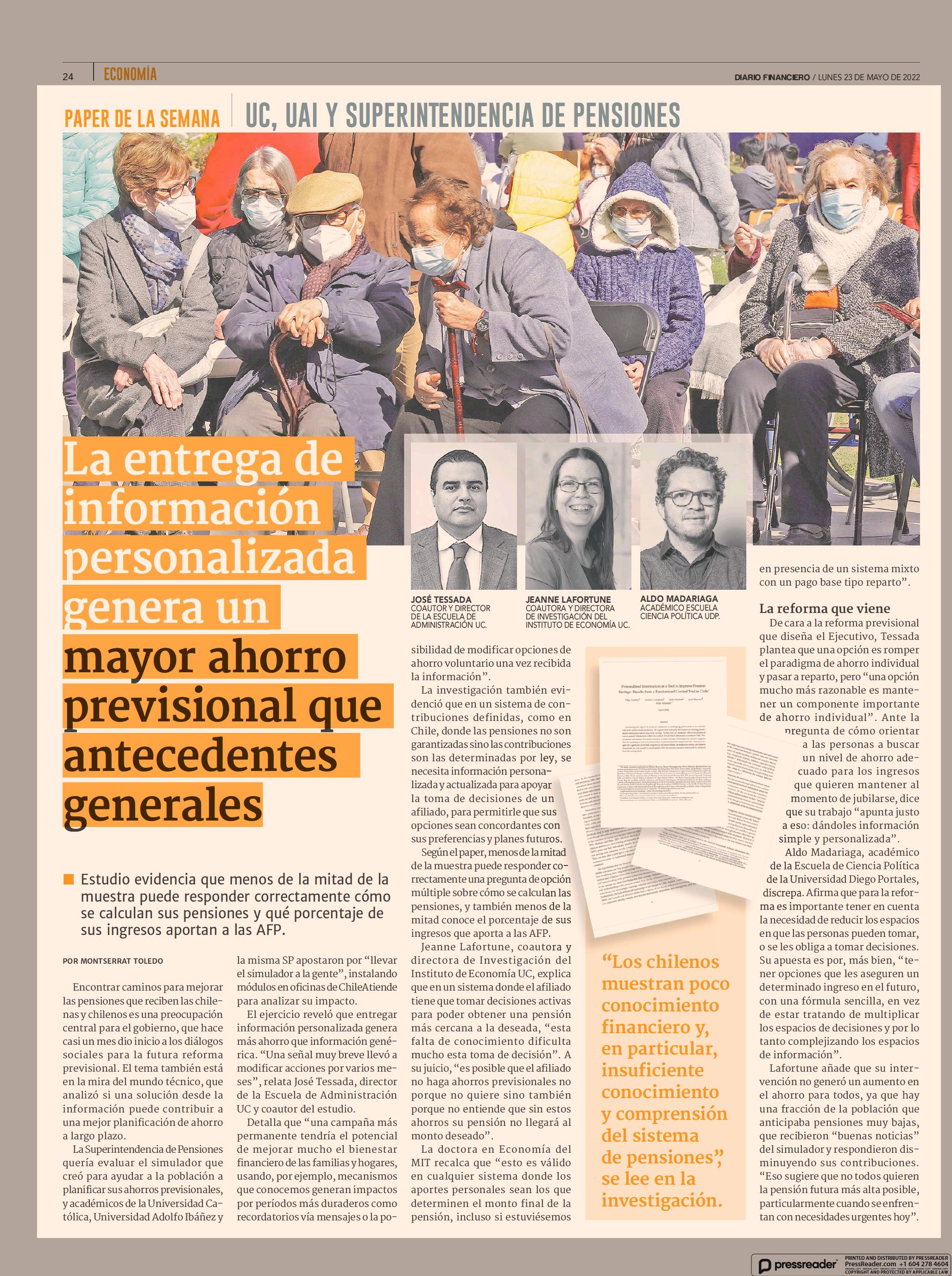 La entrega de información personalizada genera un mayor ahorro previsional que antecedentes generales 23-05-2022 Diario Financiero |