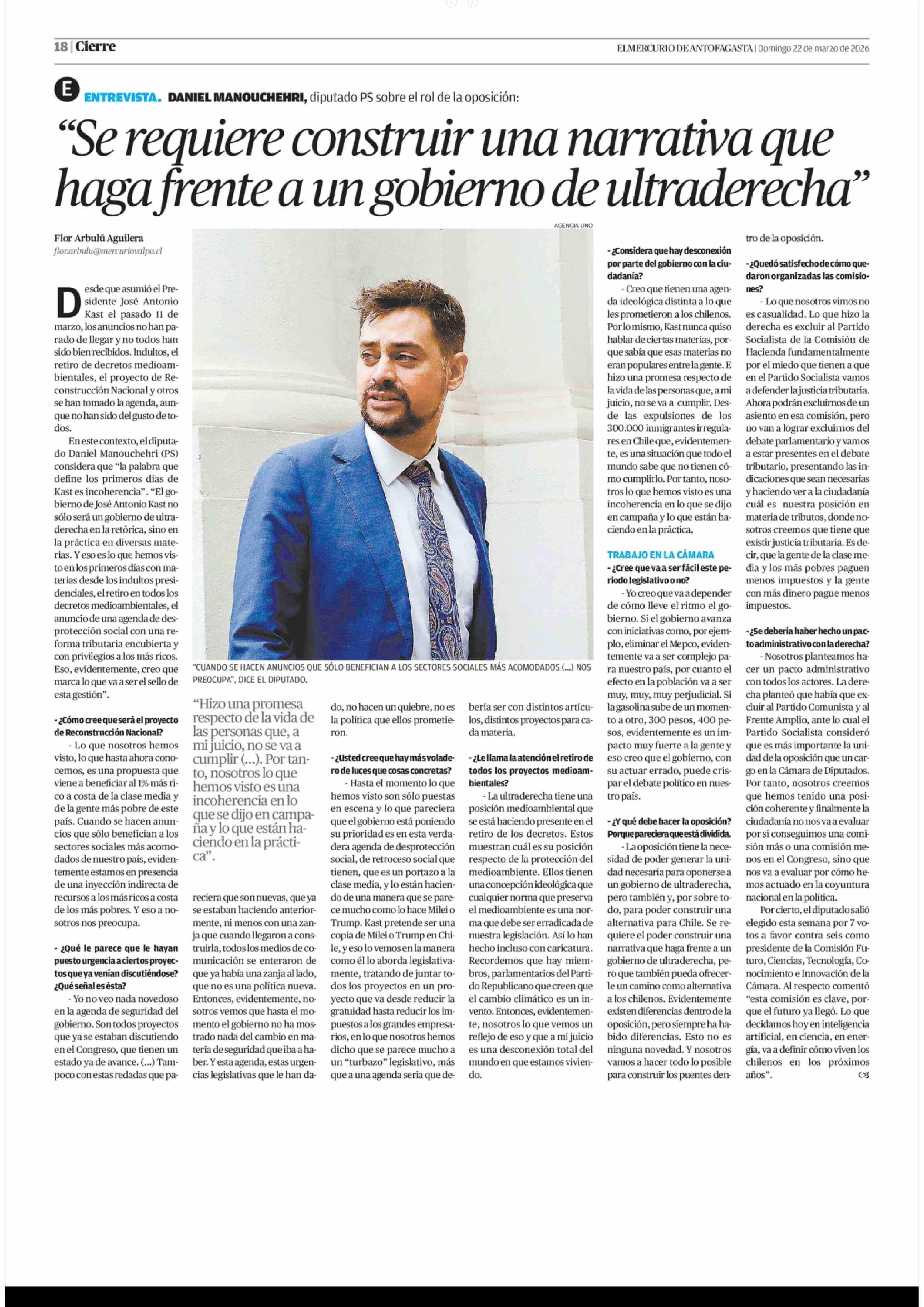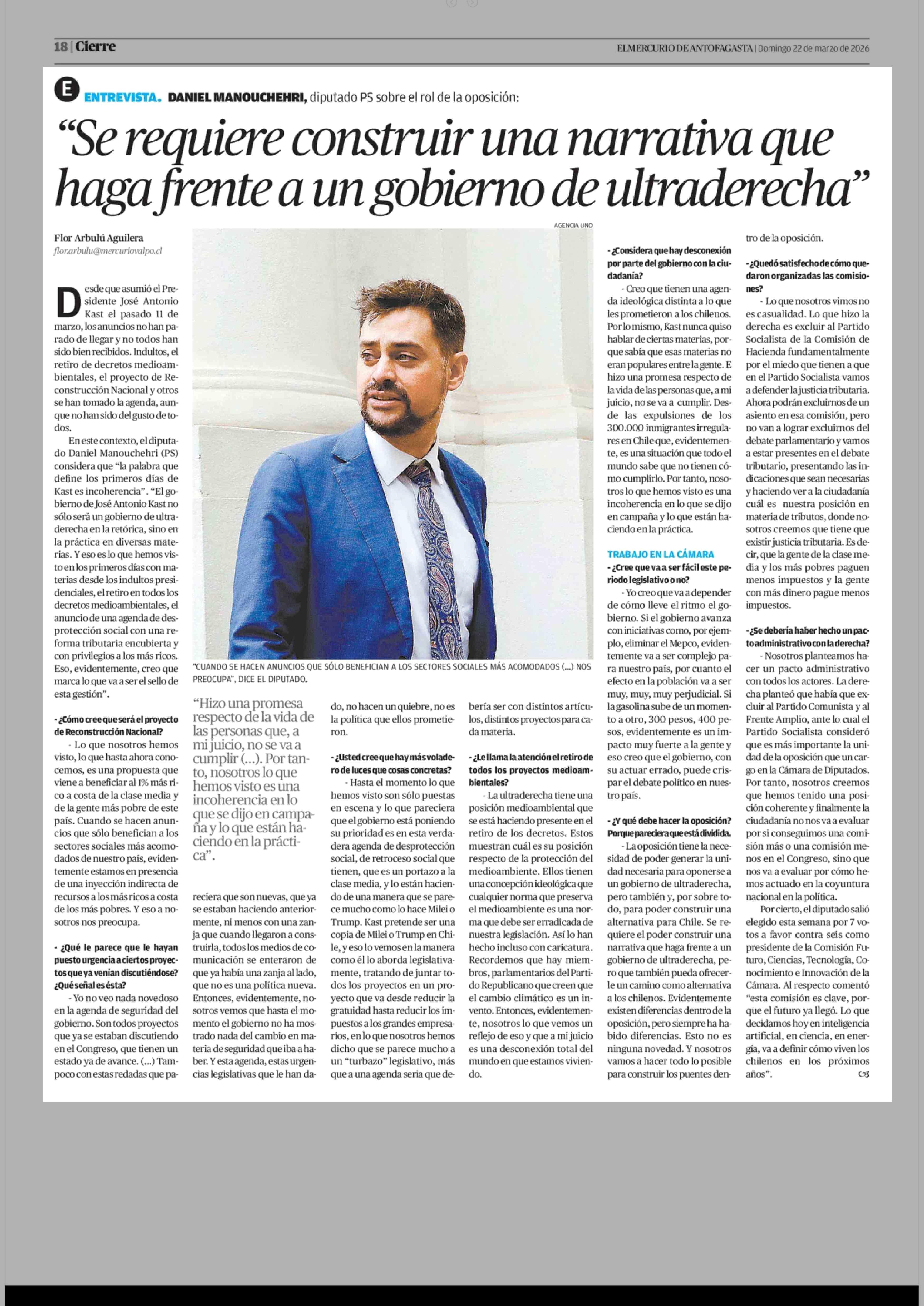 "Se requiere construir una narrativa que haga frente a un gobierno de ultraderecha" 22-03-2026 El Mercurio de Antofagasta |