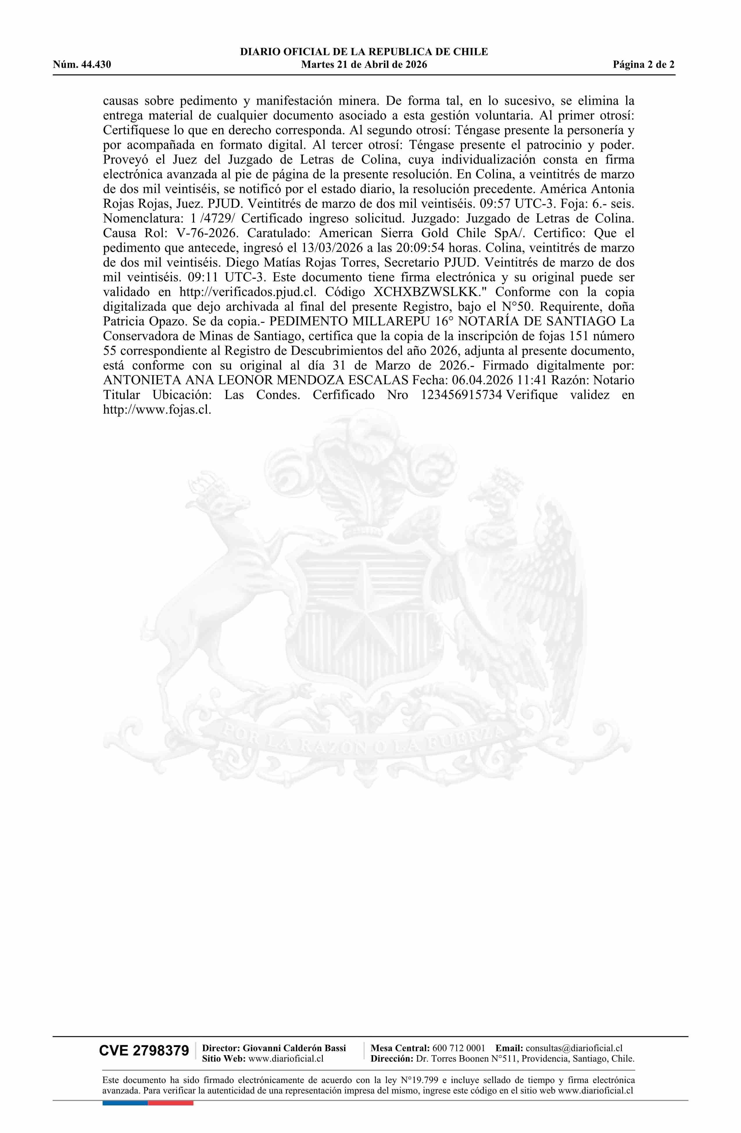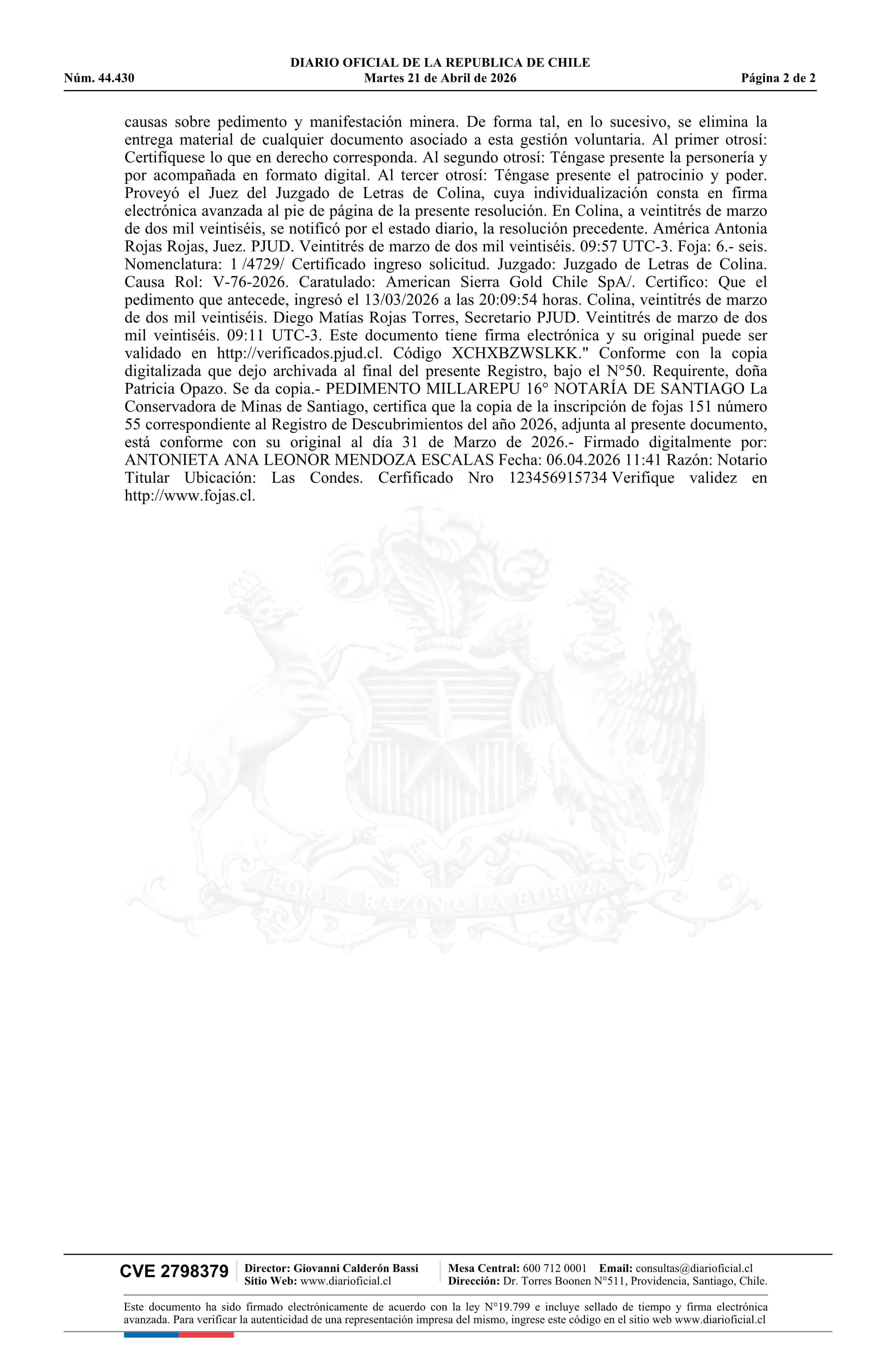 Fuente: DIARIO OFICIAL CHILE - BOLETÍN OFICIAL DE MINERÍA (DIARIO OFICIAL CHILE – BOM – PEDIMENTOS MINEROS) Página(s): 76-77