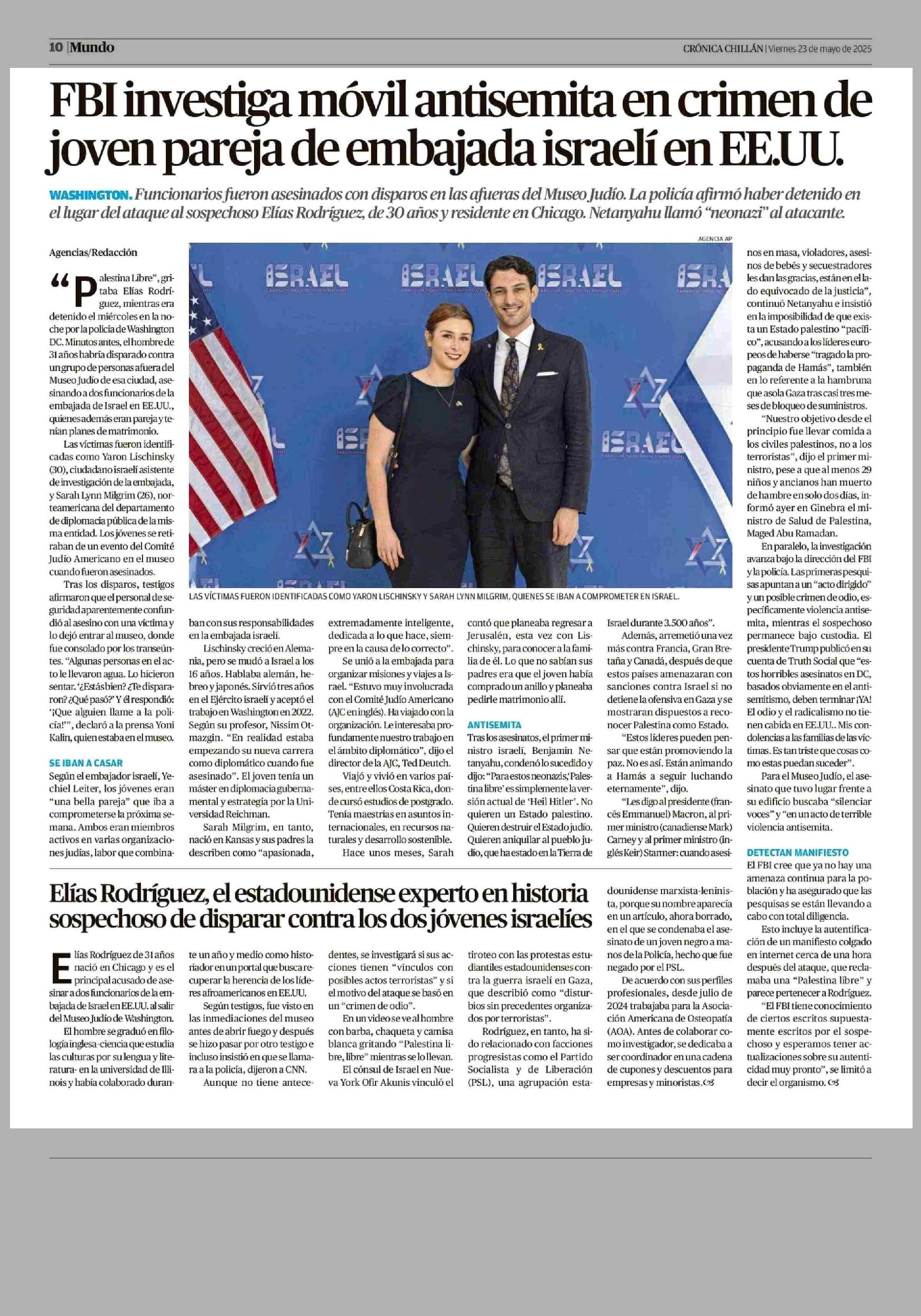 FBl investiga móvil antisemita en crimen de joven pareja de embajada israelí en EE.UU. 23-05-2025 Crónica de Chillán |