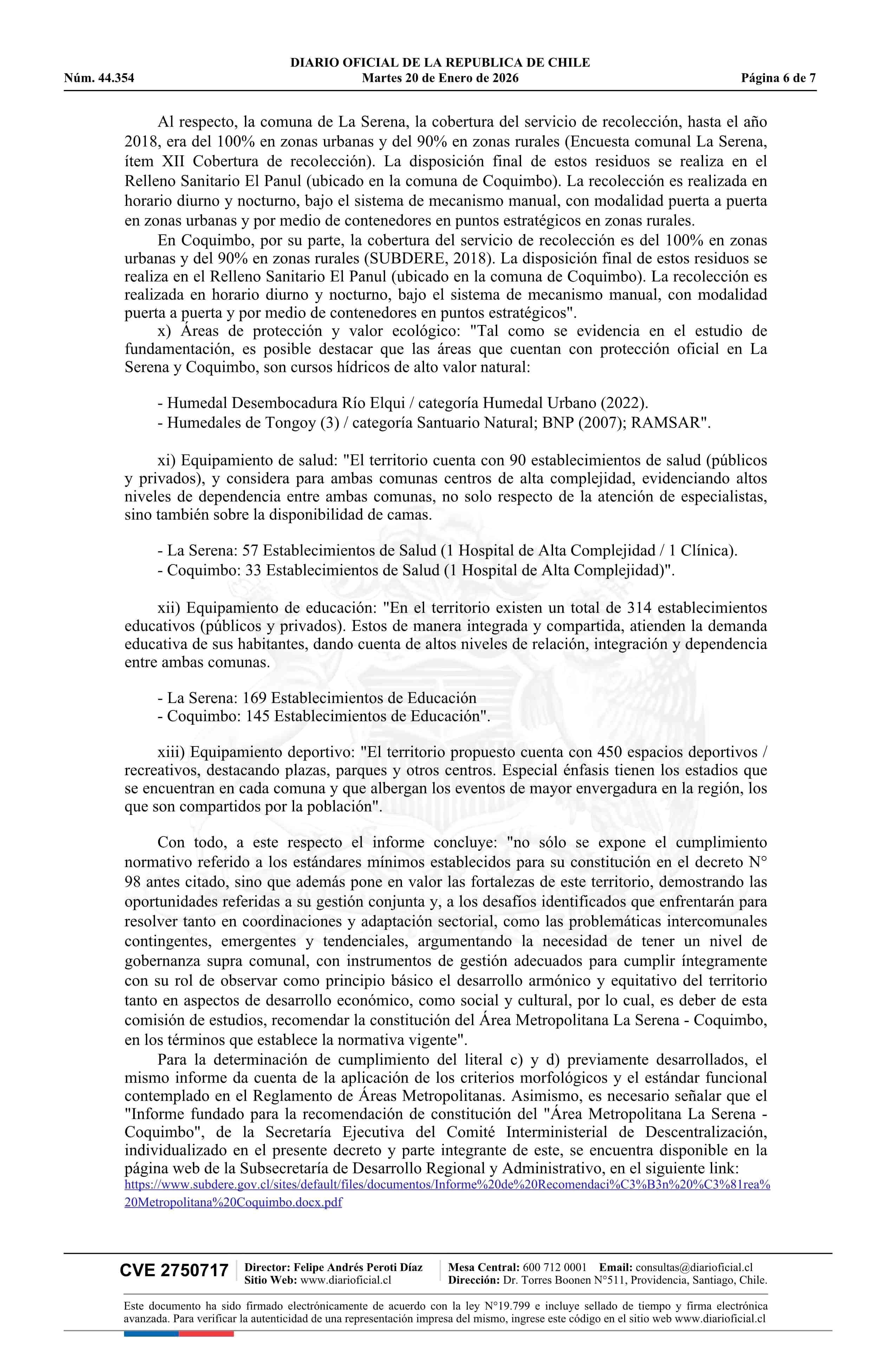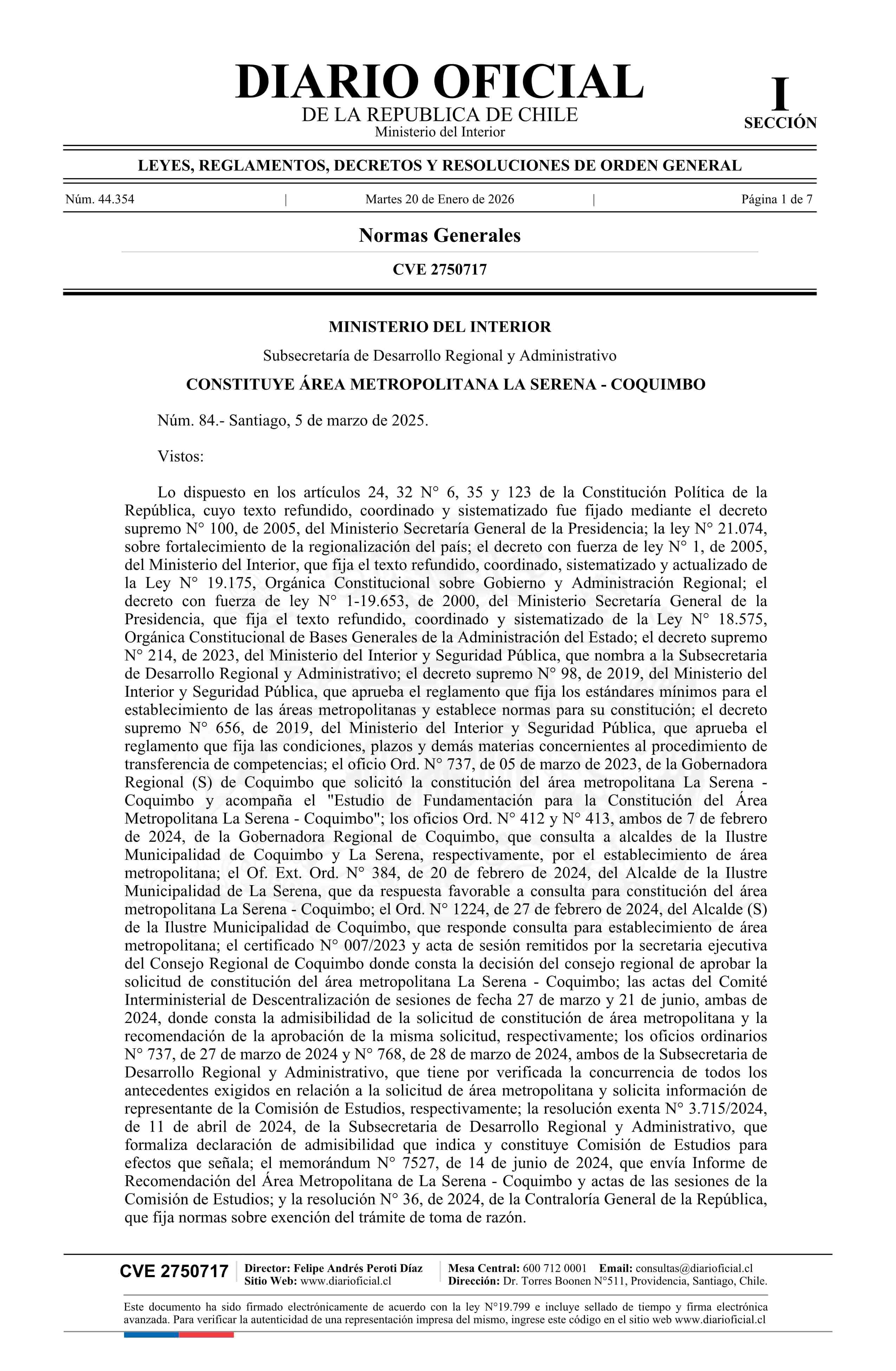Título: Decreto número 84, de 2025.- Constituye Área Metropolitana La Serena - Coquimbo