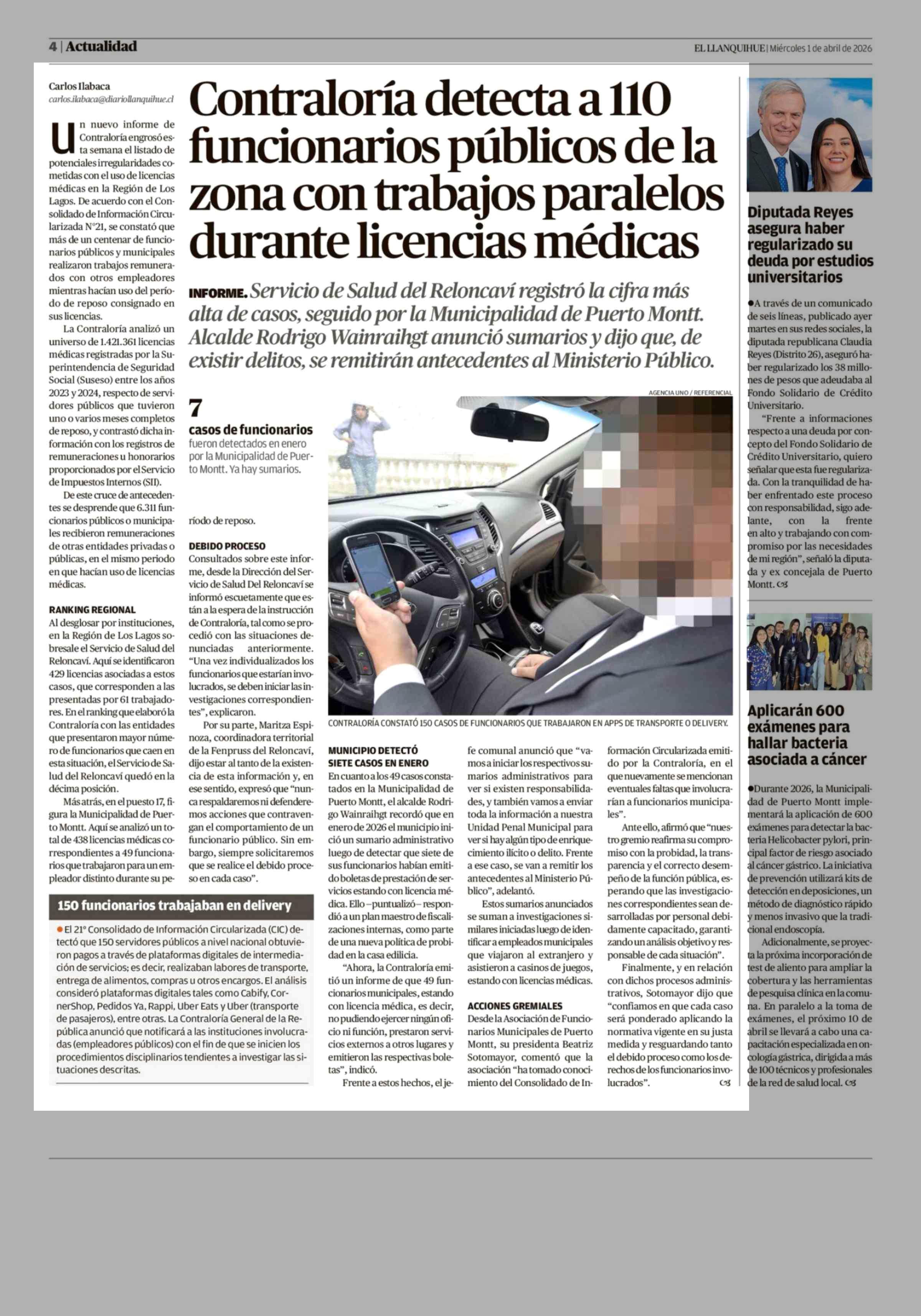 Contraloría detecta a 110 funcionarios públicos de la zona con trabajos paralelos durante licencias médicas 01-04-2026 El Llanquihue |
