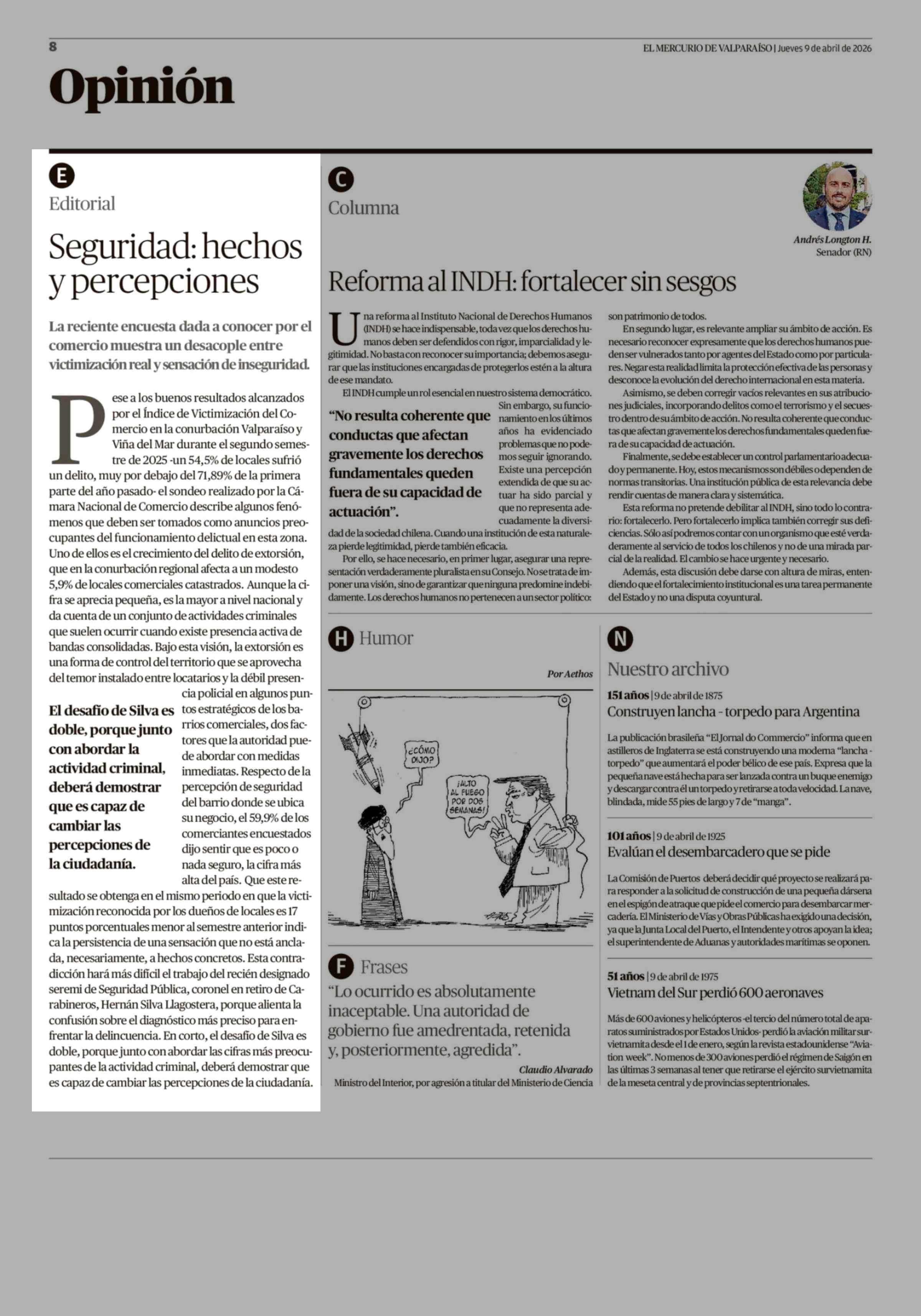 Editorial: Seguridad: hechos y percepciones 09-04-2026 El Mercurio de Valparaíso |