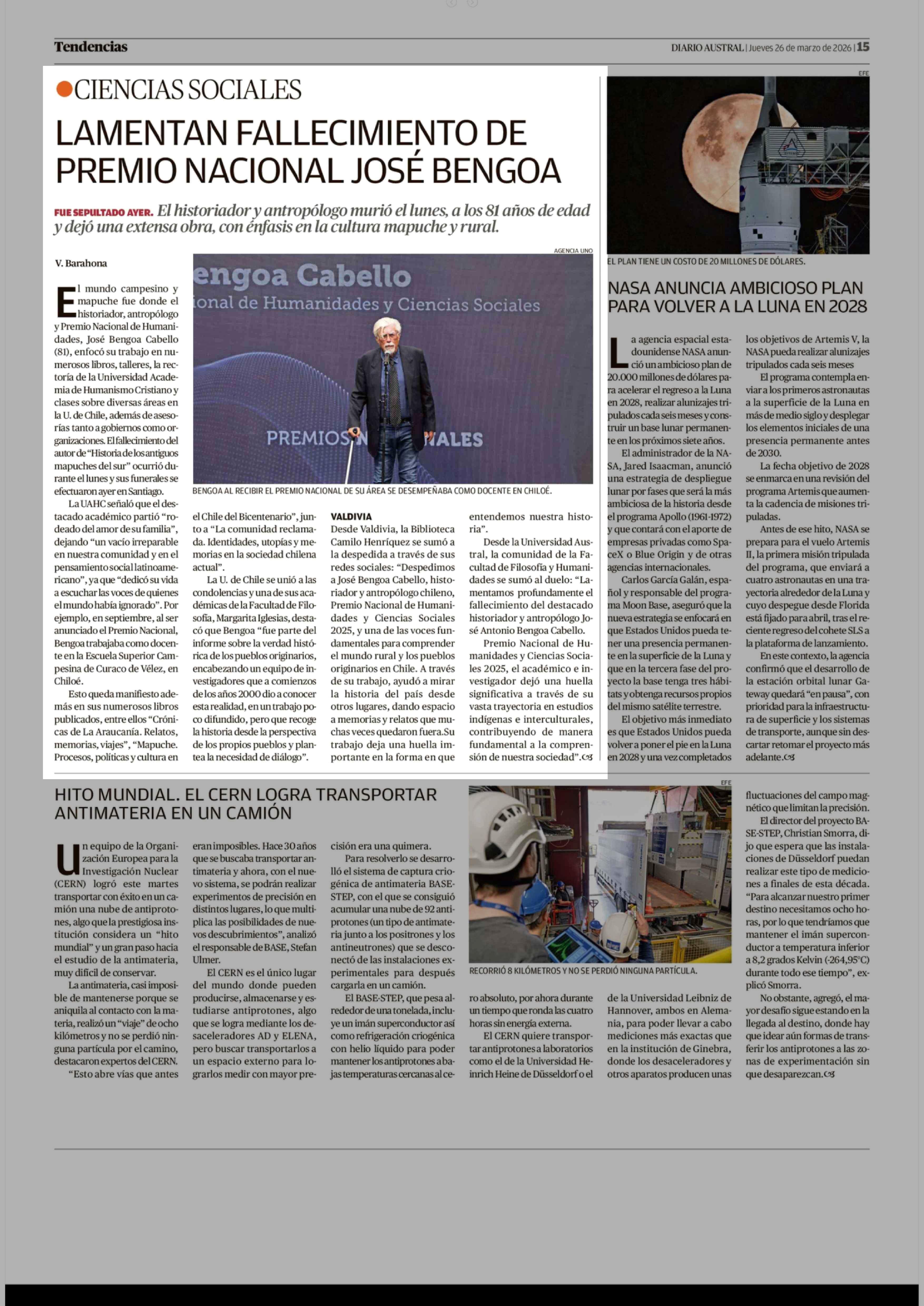 Título: LAMENTAN FALLECIMIENTO DE PREMIO NACIONAL JOSÉ BENGOA