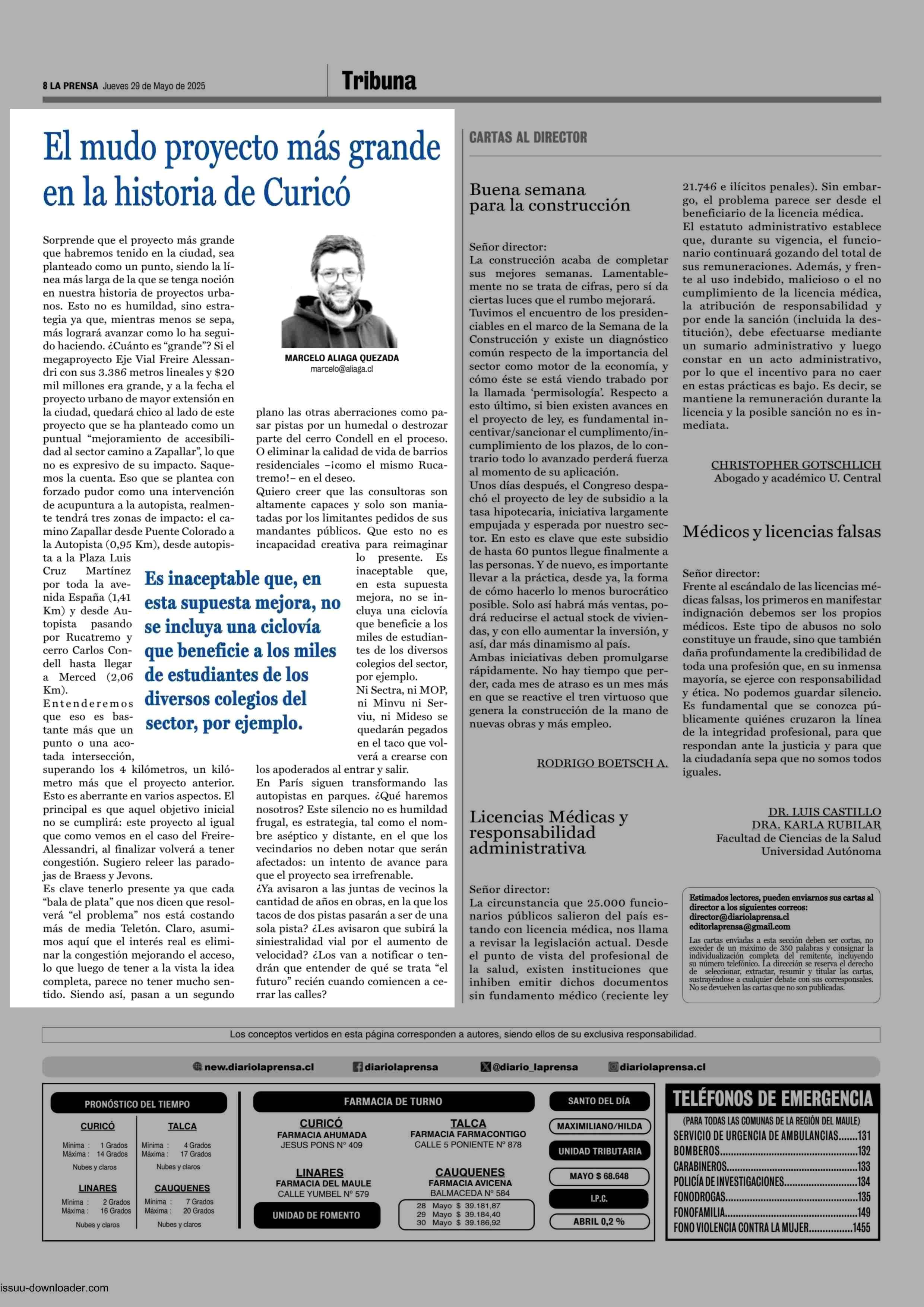 COLUMNAS DE OPINIÓN: El mudo proyecto más grande en la historia de Curicó 29-05-2025 La Prensa de Curicó |