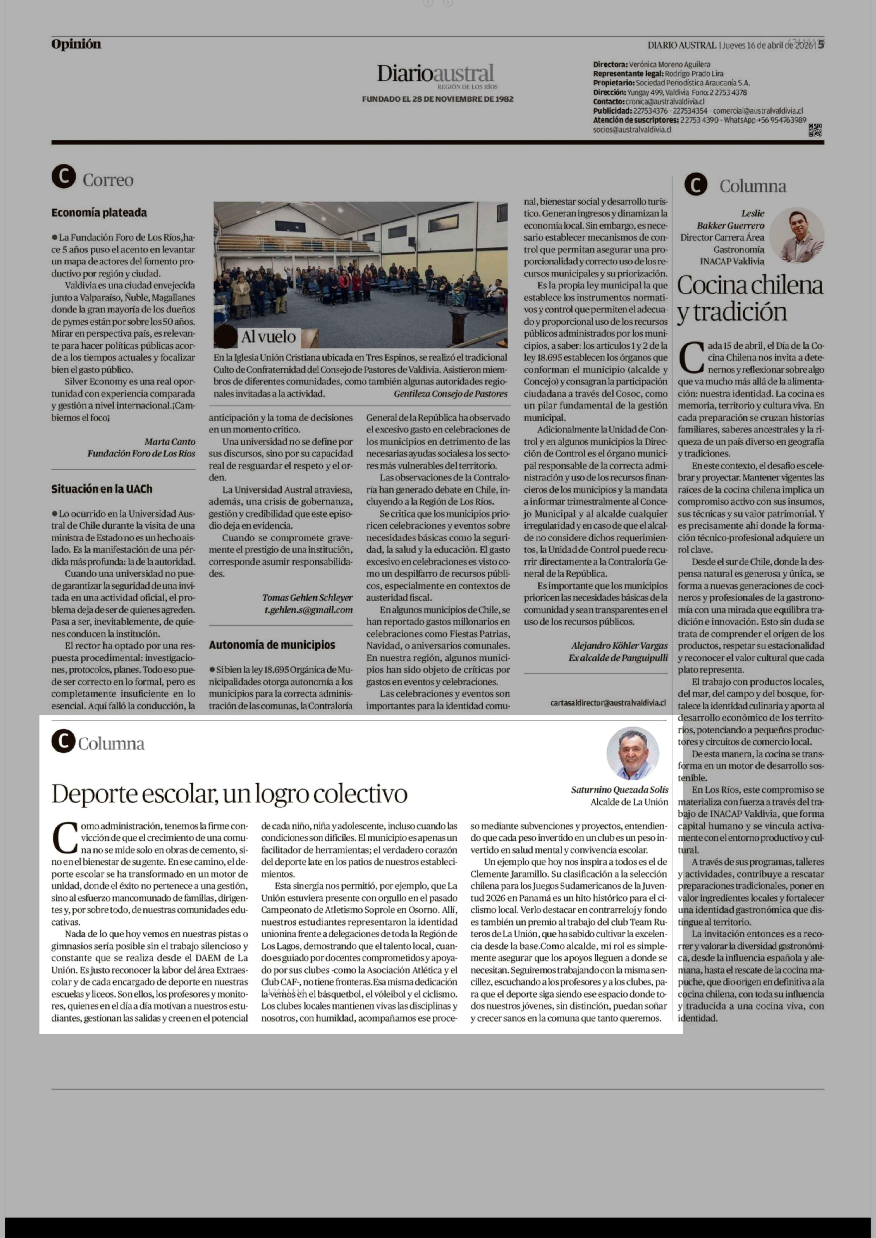 Columnas de Opinión: Deporte escolar, un logro colectivo 16-04-2026 Diario Austral Región de Los Ríos |