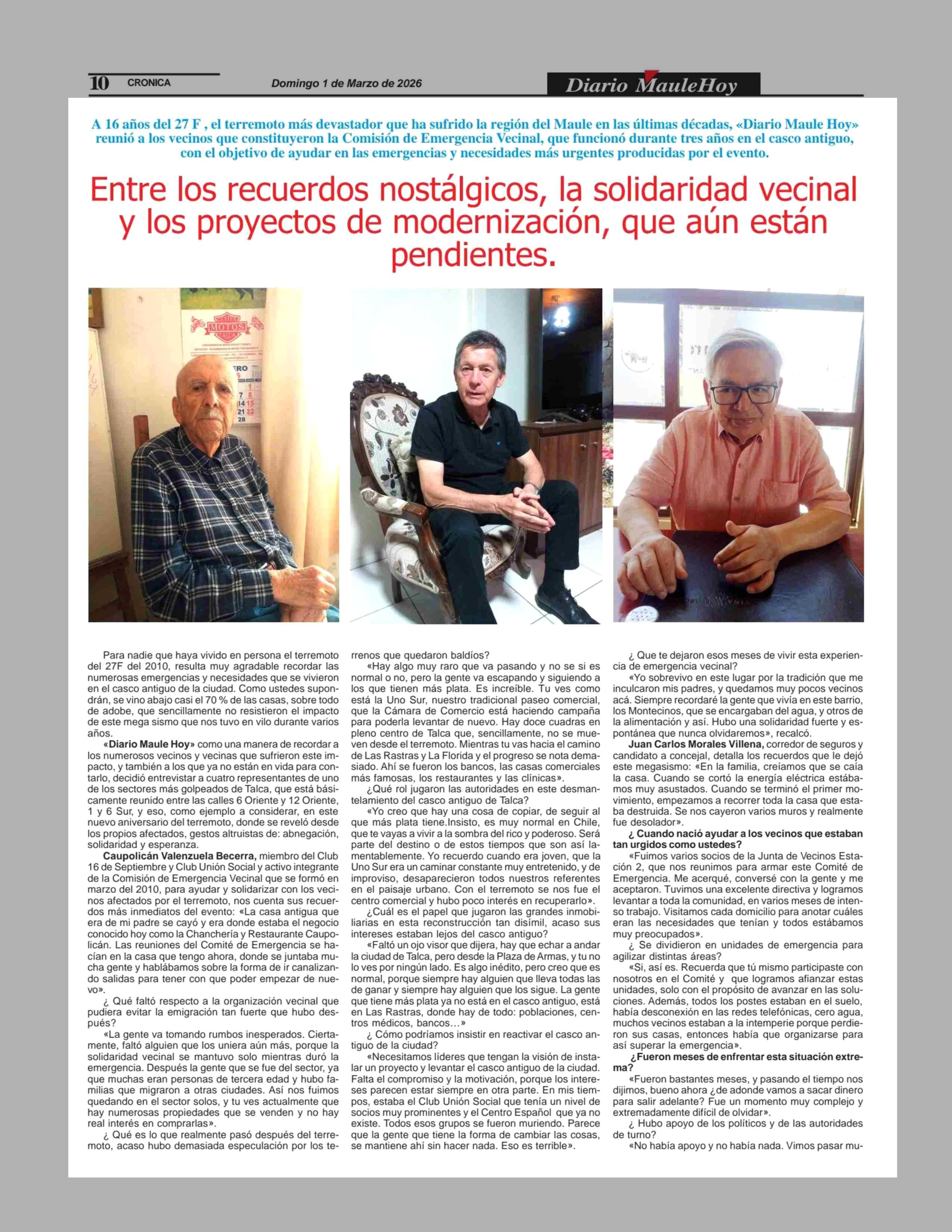Entre los recuerdos nostálgicos, la solidaridad vecinal y los proyectos de modernización, que aún están pendientes. 01-03-2026 Maule Hoy |