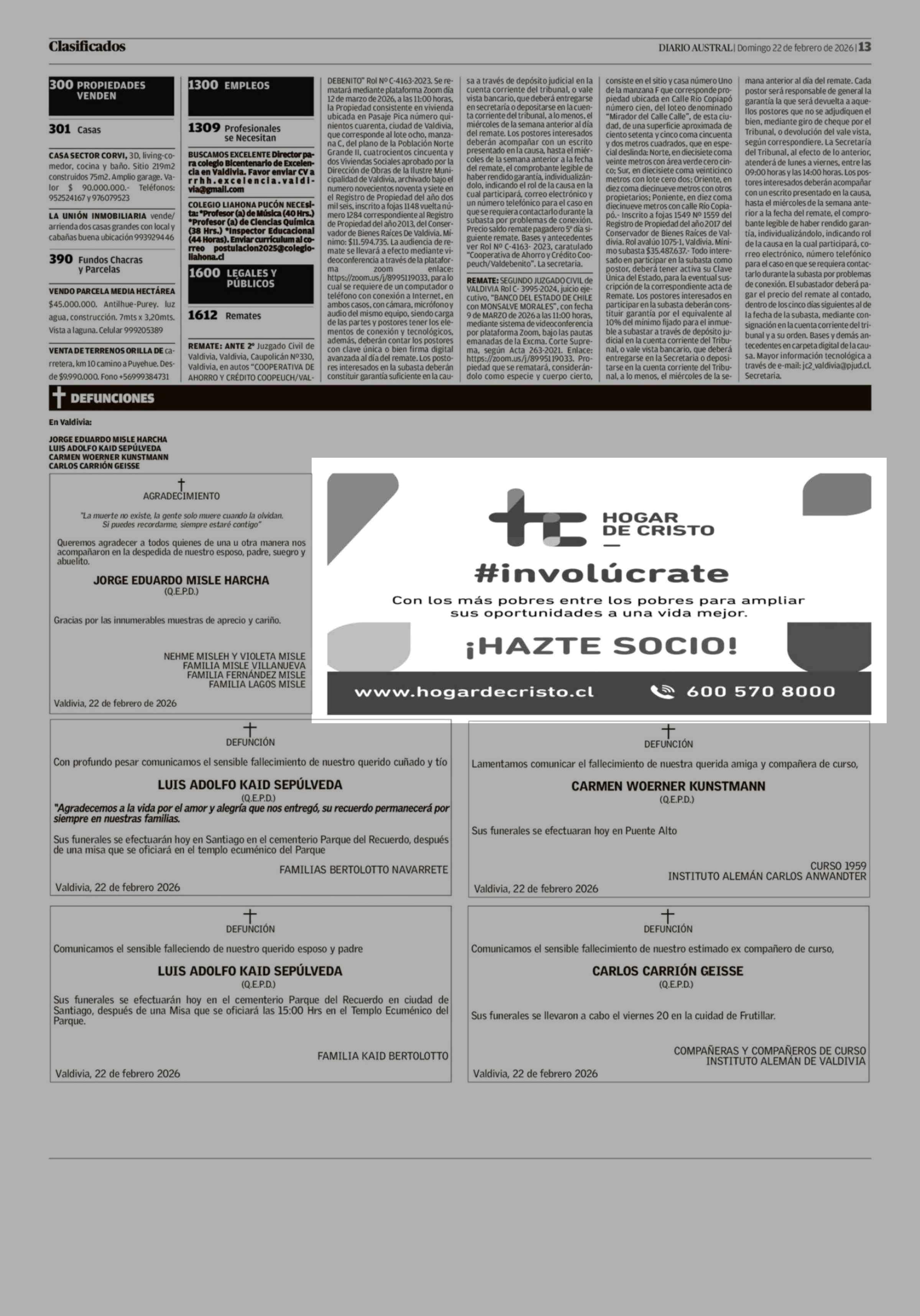 Aviso Ayuda Social: HOGAR DE CRISTO 22-02-2026 Diario Austral Región de Los Ríos |