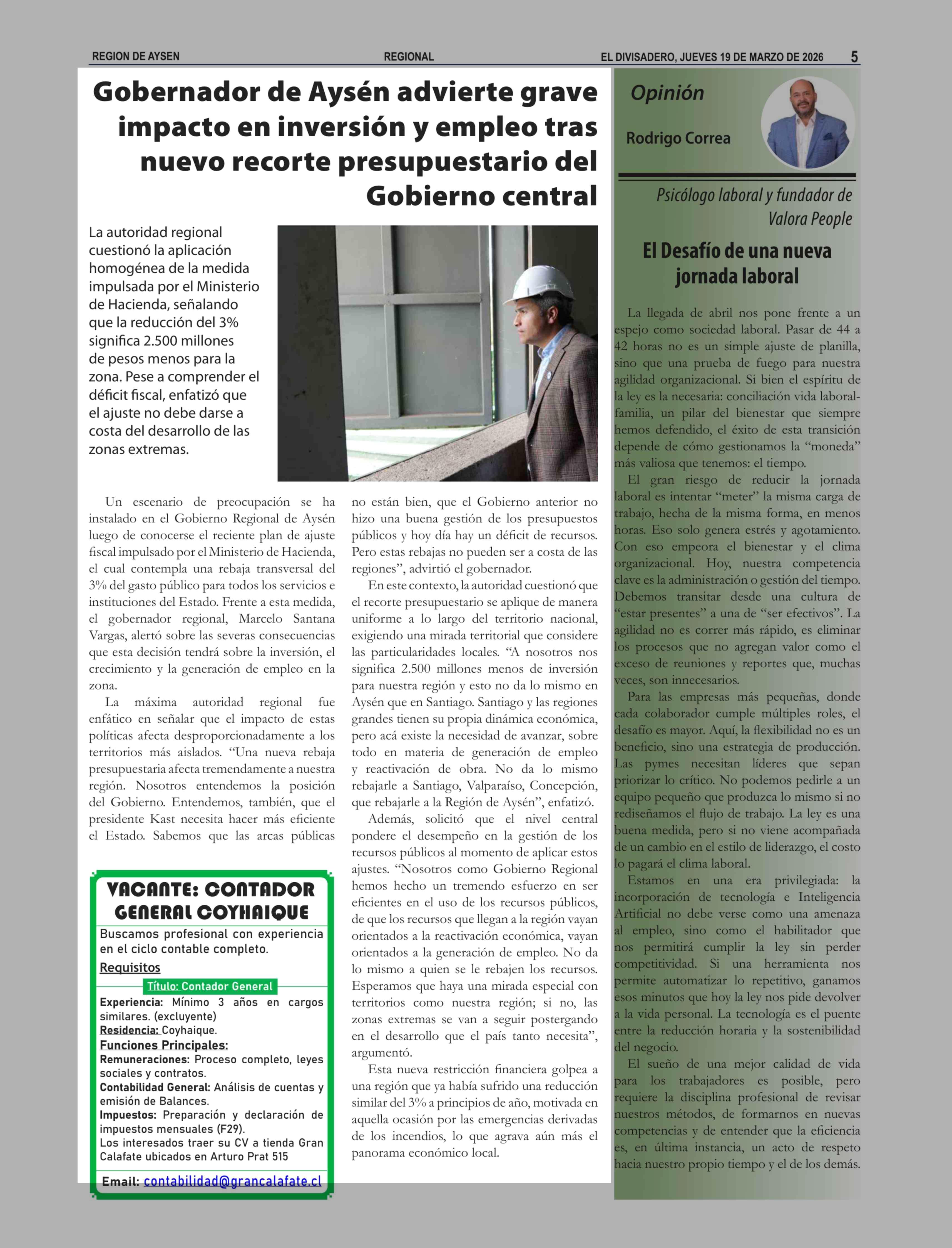 Título: Gobernador de Aysén advierte grave impacto en inversión y empleo tras nuevo recorte presupuestario del Gobierno central